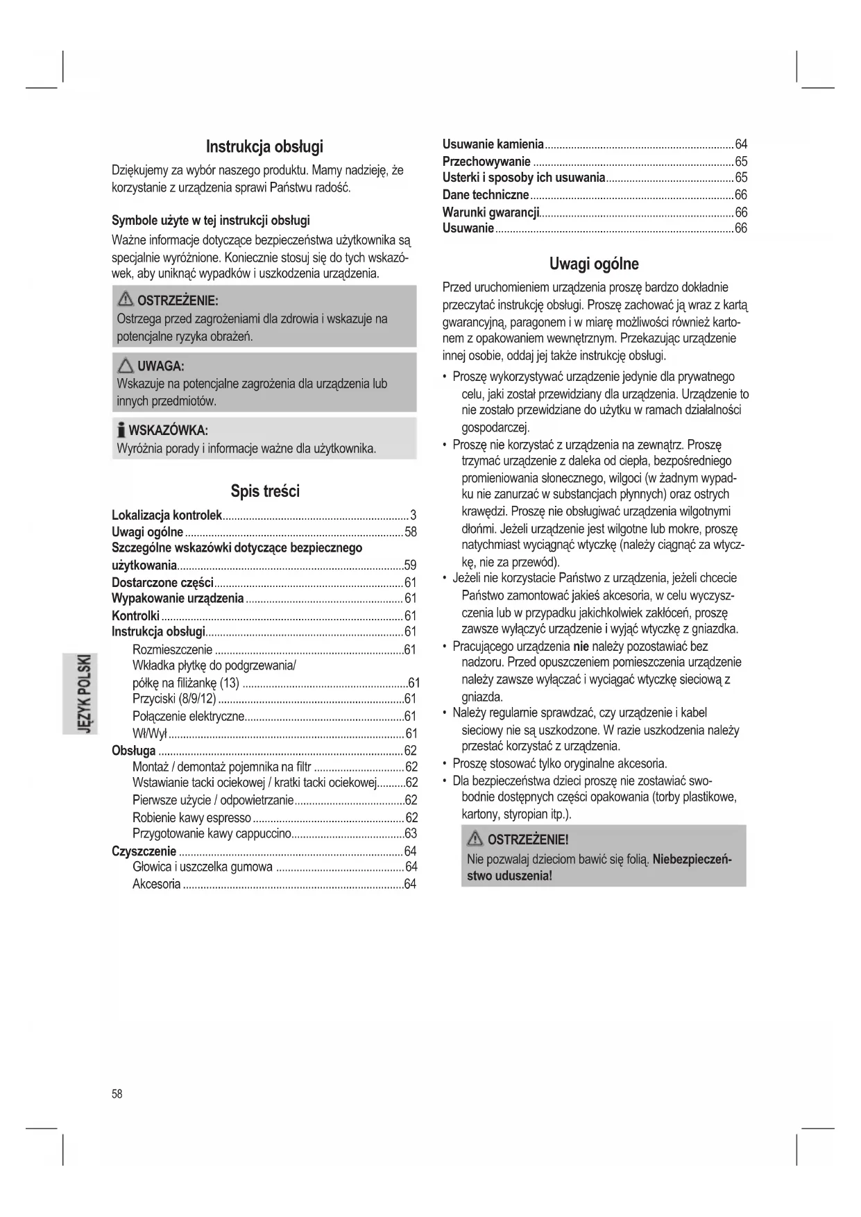 - Dla bezpieczeństwa dzieci proszę nie zostawiać swo- bodnie dostępnych części opakowania (torby plastikowe, kartony, styropian itp.). OSTRZEŻENIE! Nie pozwalaj dzieciom bawić się folią. Niebezpieczeń- stwo uduszenia! Instrukcja obsługi Dziękujemy za wybór naszego produktu. Mamy nadzieję, że korzystanie z urządzenia sprawi Państwu radość. Symbole użyte w tej instrukcji obsługi Ważne informacje dotyczące bezpieczeństwa użytkownika są specjalnie wyróżnione. Koniecznie stosuj się do tych wskazó- wek, aby uniknąć wypadków i uszkodzenia urządzenia. OSTRZEŻENIE: Ostrzega przed zagrożeniami dla zdrowia i wskazuje na potencjalne ryzyka obrażeń. UWAGA: Wskazuje na potencjalne zagrożenia dla urządzenia lub innych przedmiotów. WSKAZÓWKA: Wyróżnia porady i informacje ważne dla użytkownika. Spis treści Lokalizacja kontrolek ................................................................ 3 Uwagi ogólne ...........................................................................58 Szczególne wskazówki dotyczące bezpiecznego użytkowania..............................................................................59 Dostarczone części .................................................................61 Wypakowanie urządzenia ...................................................... 61 Kontrolki ................................................................................... 61 Instrukcja obsługi....................................................................61 Rozmieszczenie .................................................................61 Wkładka płytkę do podgrzewania/ półkę na liżankę (13) .........................................................61 Przyciski (8/9/12) ................................................................61 Połączenie elektryczne.......................................................61 Wł/Wył ................................................................................. 61 Obsługa ....................................................................................62 Montaż / demontaż pojemnika na ltr ...............................62 Wstawianie tacki ociekowej / kratki tacki ociekowej ..........62 Pierwsze użycie / odpowietrzanie ......................................62 Robienie kawy espresso .................................................... 62 Przygotowanie kawy cappuccino .......................................63 Czyszczenie .............................................................................64 Głowica i uszczelka gumowa ............................................64 Akcesoria ............................................................................6459 Szczególne wskazówki dotyczące bezpiecznego użytkowania OSTRZEŻENIE: Ryzyko oparzeń! Głowica grupowa, pojemnik na ltr, dysza pary oraz tacka na liżanki nagrzewają się podczas użytkowania.
