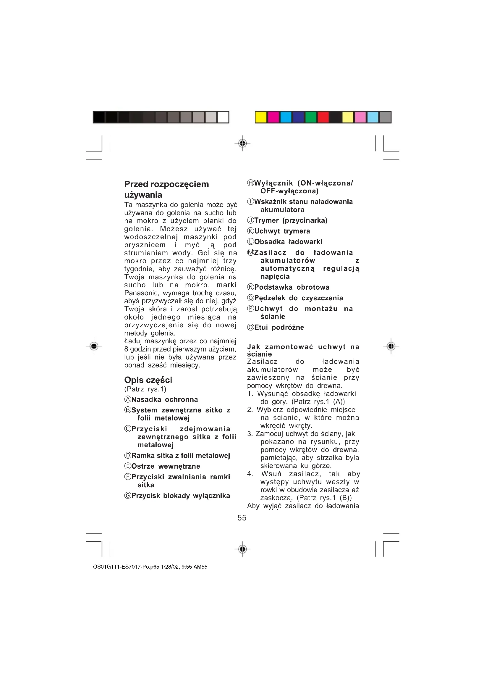 - Käytä parranajokonettasi vain sen varsinaiseen käyttötarkoitukseen tämän käyttöohjeen mukaisesti. Tuote on tarkoitettu vain kotikäyttöön. OS01G110_ES7017_EUR_Fin 1/28/02, 9:30 AM5455 Przed rozpoczęciem używania Ta maszynka do golenia może być używana do golenia na sucho lub na mokro z użyciem pianki do golenia. Możesz używać tej wodoszczelnej maszynki pod prysznicem i myć ją pod strumieniem wody. Gol się na mokro przez co najmniej trzy tygodnie, aby zauważyć różnicę. Twoja maszynka do golenia na sucho lub na mokro, marki Panasonic, wymaga trochę czasu, abyś przyzwyczaił się do niej, gdyż Twoja skóra i zarost potrzebują około jednego miesiąca na przyzwyczajenie się do nowej metody golenia. Ładuj maszynkę przez co najmniej 8 godzin przed pierwszym użyciem, lub jeśli nie była używana przez ponad sześć miesięcy. Opis części (Patrz rys.1) A Nasadka ochronna B System zewnętrzne sitko z folii metalowej C Przyciski zdejmowania zewnętrznego sitka z folii metalowej D Ramka sitka z folii metalowej E Ostrze wewnętrzne F Przyciski zwalniania ramki sitka G Przycisk blokady wyłącznika H Wyłącznik (ON-włączona/ OFF-wyłączona) I Wskaźnik stanu naładowania akumulatora J Trymer (przycinarka) K Uchwyt trymera L Obsadka ładowarki M Zasilacz do ładowania akumulatorów z automatyczną regulacją napięcia N Podstawka obrotowa O Pędzelek do czyszczenia P Uchwyt do montażu na ścianie Q Etui podróżne Jak zamontować uchwyt na ścianie Zasilacz do ładowania akumulatorów może być zawieszony na ścianie przy pomocy wkrętów do drewna.
