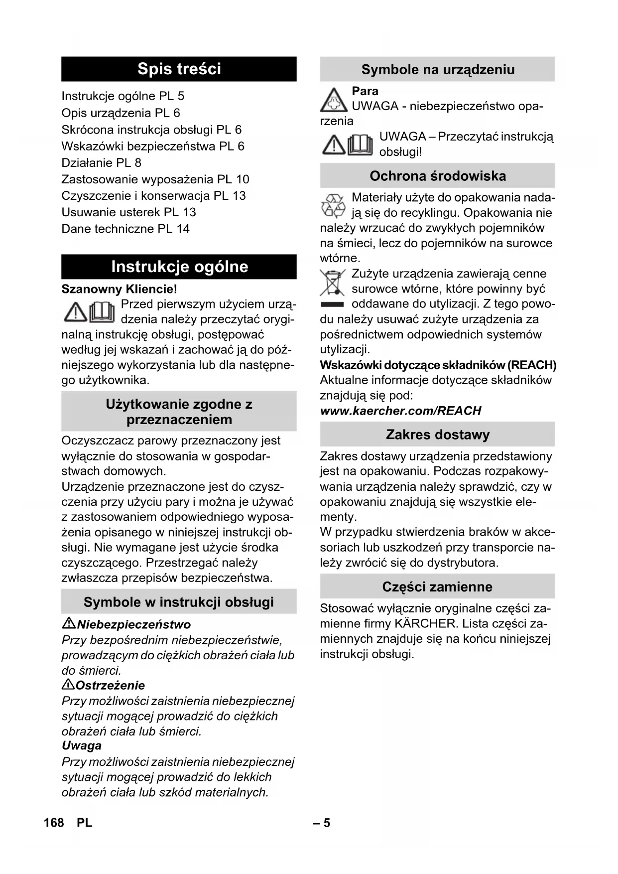 wieci zielona i pomarańczowa kontrol- ka. 5 Odczekać, aż zgaśnie pomarańczowa lampka kontrolna. 6 Odpowiedni element wyposażenia osa- dzić na pistolecie parowym. Urządzenie jest gotowe do pracy. Niebezpieczeństwo Eksploatacja urządzenia w miejscach za- grożonych wybuchem jest zabroniona. Podczas użytkowania urządzenia w ob- szarach zagrożonych należy przestrze- gać stosownych przepisów bezpieczeństwa. Nie używać urządzenia w basenach pływackich, zawierających wodę. Nie można używać urządzenia do czyszczenia urządzeń elektrycznych np. piekarników, okapów kuchennych, kuchenek mikrofalowych, telewizorów, lamp, suszarek, grzejników elektrycz- nych itd. Gwarancja Opis urządzenia A1 gniazdo urządzenia z osłoną A2 Kontrolka - Ogrzewanie (POMARAŃ- CZOWA) A3 Kontrolka (zielona) – włączone zasilanie A4 Włącz wyłącznik A5 Wyłącz wyłącznik A6 Zawór bezpieczeństwa A7 Uchwyt na akcesoria A8 Uchwyt postojowy do dyszy podłogowej A9 Przewód zasilający z wtyczką A10Wirniki (2 sztuki) A11Kółko skrętne B1 pistolet parowy B2 przycisk odblokowujący B3 Przełącznik preselekcyjny ilości pary (z zabezpieczeniem przed dziećmi) B4 Dźwignia parowania B5 wąż pary B6 wtyczka przewodu parowego C1 dysza ze strumieniem punktowym C2 szczotka okrągła C3 Dysza Power D1 dysza ręczna D2 nakładka frotte E1 Rury przedłużające (2 szt.) E2 przycisk odblokowujący F1 Ssawka podłogowa F2 klamry mocujące F3 ścierka do podłóg G1 ściągaczka do szyb Opcja H1 Ciśnieniowe żelazko parowe H2 Wyłącznik pary (dół) H3 Kontrolka - Ogrzewanie (POMARAŃ- CZOWA) H4 Wyłącznik pary (góra) H5 Blokada wyłącznika pary H6 regulator temperatury H7 wtyczka przewodu parowego Skrócona instrukcja obsługi Wskazówki bezpieczeństwa 169PL– 7 Przed użyciem urządzenia i akcesoriów należy sprawdzić ich stan. Jeżeli stan techniczny budzi zastrzeżenia, to sprzętu takiego nie wolno używać. Szczególnie należy sprawdzić przewód sieciowy, zamknięcie bezpieczeństwa i przewód parowy. W przypadku uszkodzenia przewodu zasilającego niezwłocznie zlecić jego wymianę przez autoryzowany serwis lub wykwalifikowanego elektryka. Uszkodzony przewód parowy należy niezwłocznie wymienić. Wolno stoso- wać tylko zalecane przez producenta przewody parowe (numer katalogowy patrz Specyfikacja części zamiennych). Nigdy nie dotykać wtyczki ani gniazdka mokrymi rękami. Nie czyścić parą przedmiotów zawiera- jących materiały szkodliwe dla zdrowia (np. azbest). Nigdy nie dotykać ręką strumienia pary z małej odległości, ani nie kierować