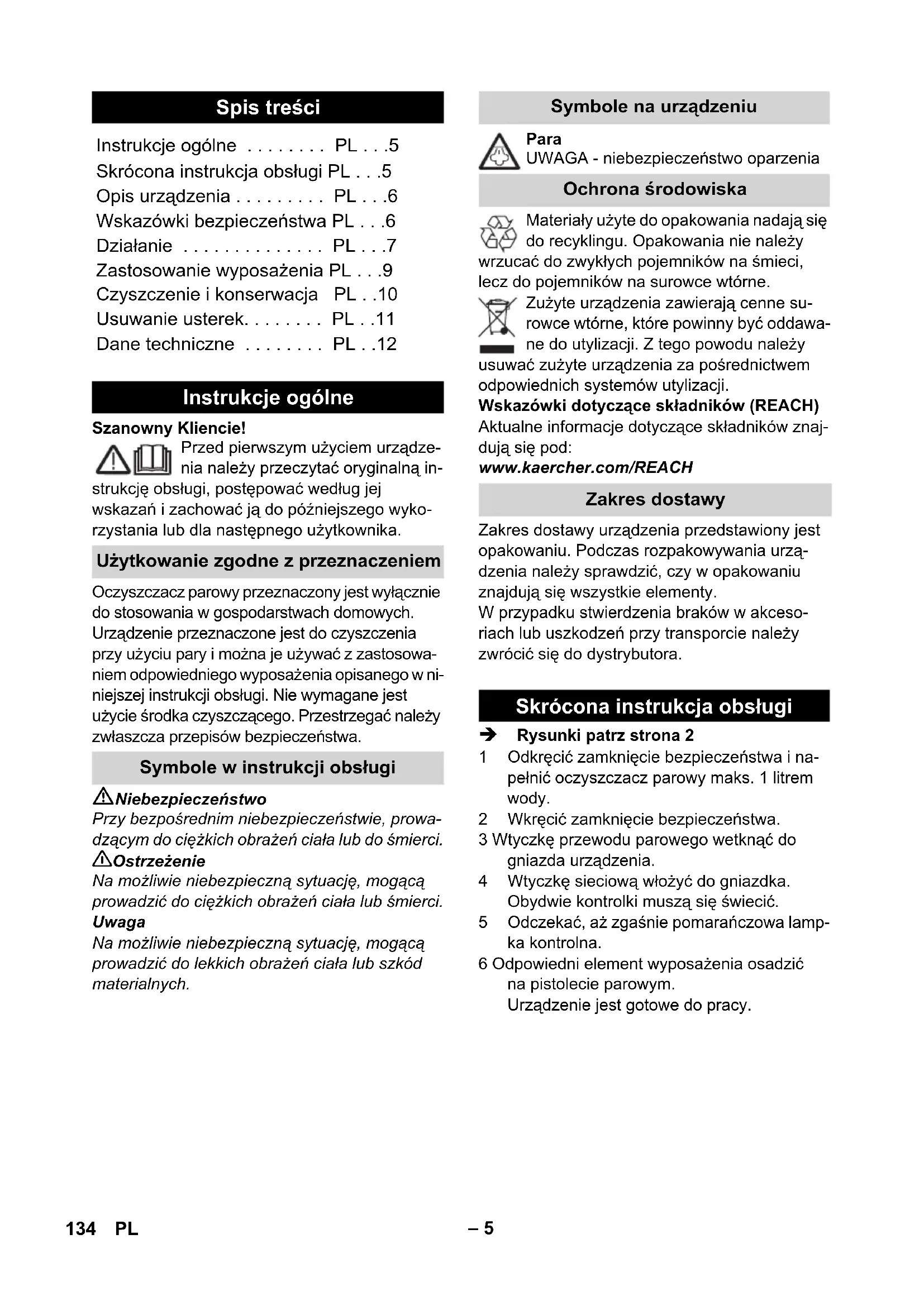 • Stopnja zaščite IP X4 Razred zaščite I Podatki o zmogljivosti Ogrevalna moč 1500 W Ogrevalna moč likalnika 750 W Maks. delovni tlak 0,32 MPa Čas ogrevanja 8 minut Maks. količina pare 40 g/min Mere Parni kotliček 1,0 l Dolžina 380 mm Širina 254 mm Višina 260 mm Teža (brez pribora) 2,9 kg 133SL– 5 Szanowny Kliencie! Przed pierwszym użyciem urządze- nia należy przeczytać oryginalną in- strukcję obsługi, postępować według jej wskazań i zachować ją do późniejszego wyko- rzystania lub dla następnego użytkownika. Oczyszczacz parowy przeznaczony jest wyłącznie do stosowania w gospodarstwach domowych. Urządzenie przeznaczone jest do czyszczenia przy użyciu pary i można je używać z zastosowa- niem odpowiedniego wyposażenia opisanego w ni- niejszej instrukcji obsługi. Nie wymagane jest użycie środka czyszczącego. Przestrzegać należy zwłaszcza przepisów bezpieczeństwa. Niebezpieczeństwo Przy bezpośrednim niebezpieczeństwie, prowa- dzącym do ciężkich obrażeń ciała lub do śmierci. 몇 Ostrzeżenie Na możliwie niebezpieczną sytuację, mogącą prowadzić do ciężkich obrażeń ciała lub śmierci. Uwaga Na możliwie niebezpieczną sytuację, mogącą prowadzić do lekkich obrażeń ciała lub szkód materialnych. Para UWAGA - niebezpieczeństwo oparzenia Materiały użyte do opakowania nadają się do recyklingu. Opakowania nie należy wrzucać do zwykłych pojemników na śmieci, lecz do pojemników na surowce wtórne. Zużyte urządzenia zawierają cenne su- rowce wtórne, które powinny być oddawa- ne do utylizacji. Z tego powodu należy usuwać zużyte urządzenia za pośrednictwem odpowiednich systemów utylizacji. Wskazówki dotyczące składników (REACH) Aktualne informacje dotyczące składników znaj- dują się pod: www.kaercher.com/REACH Zakres dostawy urządzenia przedstawiony jest opakowaniu. Podczas rozpakowywania urzą- dzenia należy sprawdzić, czy w opakowaniu znajdują się wszystkie elementy. W przypadku stwierdzenia braków w akceso- riach lub uszkodzeń przy transporcie należy zwrócić się do dystrybutora. Rysunki patrz strona 2 1 Odkręcić zamknięcie bezpieczeństwa i na- pełnić oczyszczacz parowy maks. 1 litrem wody. 2 Wkręcić zamknięcie bezpieczeństwa. 3 Wtyczkę przewodu parowego wetknąć do gniazda urządzenia. 4 Wtyczkę sieciową włożyć do gniazdka. Obydwie kontrolki muszą się świecić. 5 Odczekać, aż zgaśnie pomarańczowa lamp- ka kontrolna. 6 Odpowiedni element wyposażenia osadzić na pistolecie parowym. Urządzenie jest gotowe do pracy. Spis treści Instrukcje ogólne