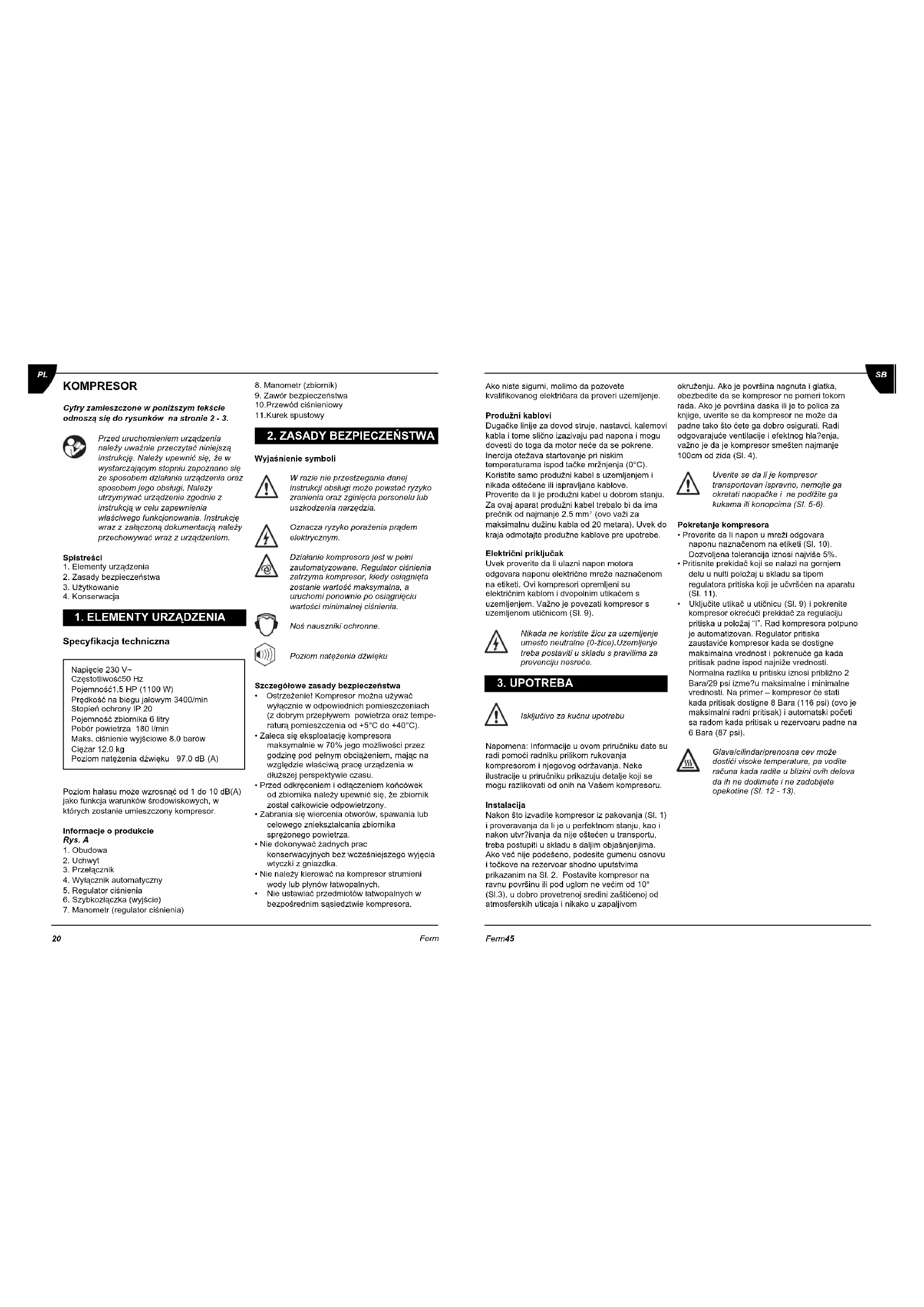 Ferm KOMPRESOR Cyfry zamieszczone w poniższym tekście odnoszą się do rysunków na stronie 2 - 3. Przed uruchomieniem urządzenia należy uważnie przeczytać niniejszą instrukcję. Należy upewnić się, że w wystarczającym stopniu zapoznano się ze sposobem działania urządzenia oraz sposobem jego obsługi. Należy utrzymywać urządzenie zgodnie z instrukcją w celu zapewnienia właściwego funkcjonowania. Instrukcję wraz z załączoną dokumentacją należy przechowywać wraz z urządzeniem. Spistreści
