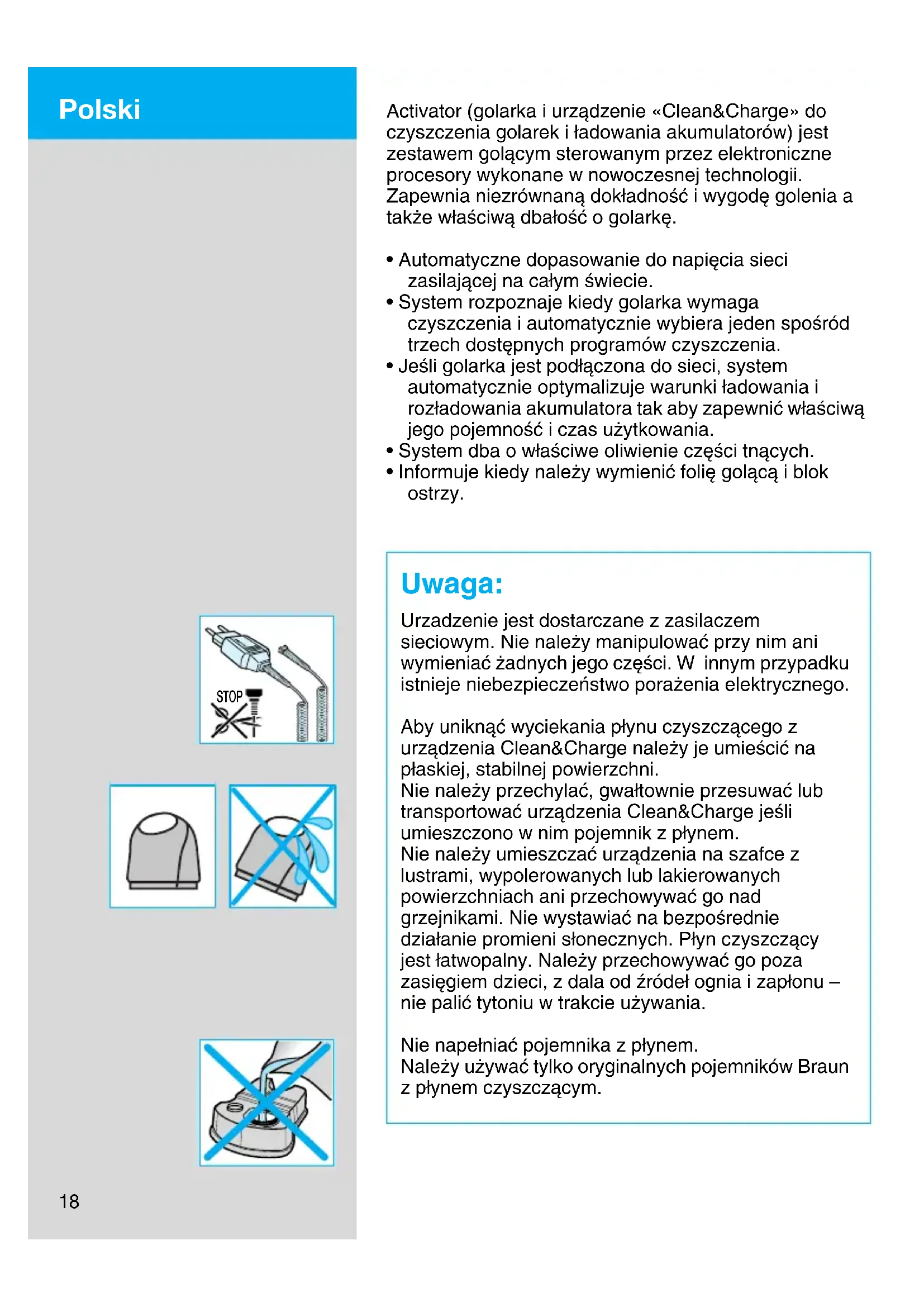 - Informuje kiedy nale˝y wymieniç foli´ golàcà i blok ostrzy. Uwaga: Urzadzenie jest dostarczane z zasilaczem sieciowym. Nie nale˝y manipulowaç przy nim ani wymieniaç ˝adnych jego cz´Êci. W innym przypadku istnieje niebezpieczeƒstwo pora˝enia elektrycznego. Aby uniknàç wyciekania p∏ynu czyszczàcego z urzàdzenia Clean&Charge nale˝y je umieÊciç na p∏askiej, stabilnej powierzchni. Nie nale˝y przechylaç, gwa∏townie przesuwaç lub transportowaç urzàdzenia Clean&Charge jeÊli umieszczono w nim pojemnik z p∏ynem. Nie nale˝y umieszczaç urzàdzenia na szafce z lustrami, wypolerowanych lub lakierowanych powierzchniach ani przechowywaç go nad grzejnikami. Nie wystawiaç na bezpoÊrednie dzia∏anie promieni s∏onecznych. P∏yn czyszczàcy jest ∏atwopalny. Nale˝y przechowywaç go poza zasi´giem dzieci, z dala od êróde∏ ognia i zap∏onu – nie paliç tytoniu w trakcie u˝ywania. Nie nape∏niaç pojemnika z p∏ynem. Nale˝y u˝ywaç tylko oryginalnych pojemników Braun z p∏ynem czyszczàcym. STOP Polski 5644451_S4_102 Seite 18 Montag, 8. September 2003 1:20 1319 Opis urzàdzenia