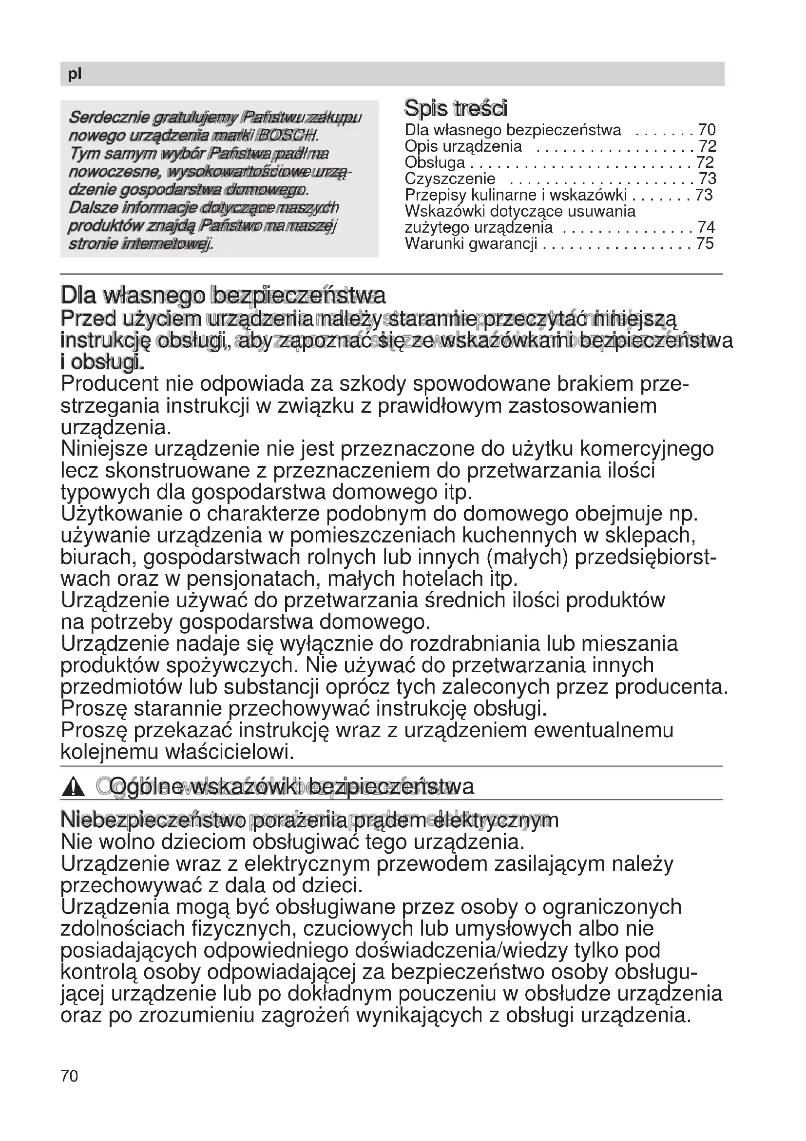 - Warunki gwarancji Dla własnego bezpieczeństwa Przed użyciem urządzenia należy starannie przeczytać niniejszą instrukcję obsługi, aby zapoznać się ze wskazówkami bezpieczeństwa i obsługi. Producent nie odpowiada za szkody spowodowane brakiem prze- strzegania instrukcji w związku z prawidłowym zastosowaniem urządzenia. Niniejsze urządzenie nie jest przeznaczone do użytku komercyjnego lecz skonstruowane z przeznaczeniem do przetwarzania ilości typowych dla gospodarstwa domowego itp. Użytkowanie o charakterze podobnym do domowego obejmuje np. używanie urządzenia w pomieszczeniach kuchennych w sklepach, biurach, gospodarstwach rolnych lub innych (małych) przedsiębiorst- wach oraz w pensjonatach, małych hotelach itp. Urządzenie używać do przetwarzania średnich ilości produktów na potrzeby gospodarstwa domowego. Urządzenie nadaje się wyłącznie do rozdrabniania lub mieszania produktów spożywczych. Nie używać do przetwarzania innych przedmiotów lub substancji oprócz tych zaleconych przez producenta. Proszę starannie przechowywać instrukcję obsługi. Proszę przekazać instrukcję wraz z urządzeniem ewentualnemu kolejnemu właścicielowi. , Ogólne wskazówki bezpieczeństwa Niebezpieczeństwo porażenia prądem elektrycznym Nie wolno dzieciom obsługiwać tego urządzenia. Urządzenie wraz z elektrycznym przewodem zasilającym należy przechowywać z dala od dzieci. Urządzenia mogą być obsługiwane przez osoby o ograniczonych zdolnościach fizycznych, czuciowych lub umysłowych albo nie posiadających odpowiedniego doświadczenia/wiedzy tylko pod kontrolą osoby odpowiadającej za bezpieczeństwo osoby obsługu- jącej urządzenie lub po dokładnym pouczeniu w obsłudze urządzenia oraz po zrozumieniu zagrożeń wynikających z obsługi urządzenia. p. 75