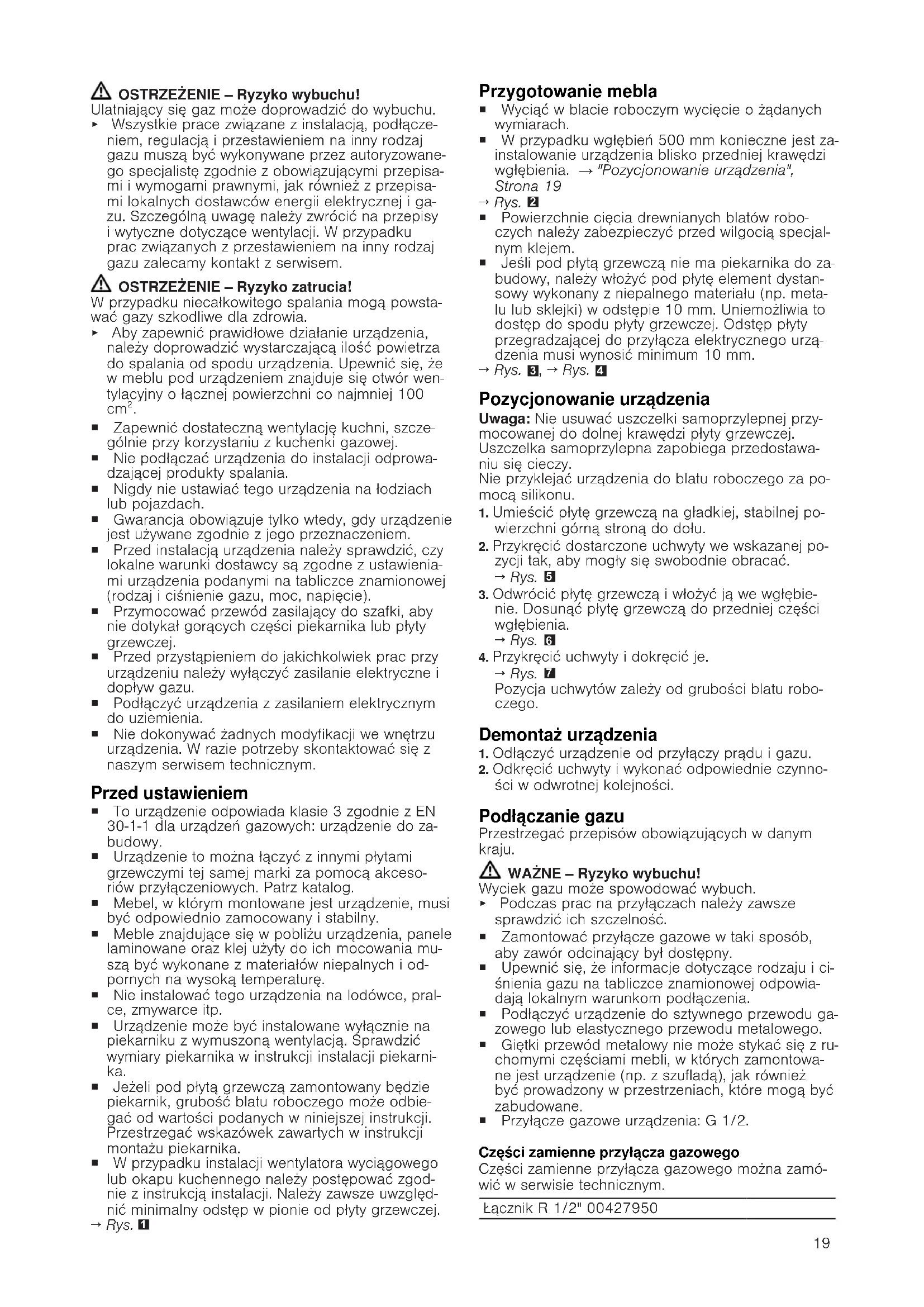 Bezpieczny montaż Podczas montażu urządzenia należy przestrzegać zasad bezpieczeństwa. ¡ Należy dokładnie przeczytać niniejszą instrukcję. ¡ Ilustracje przedstawione w niniejszej instrukcji ma- ją charakter orientacyjny. ¡ Bezpieczeństwo podczas użytkowania zapewnione jest tylko po prawidłowym zamontowaniu zgodnie z instrukcją montażu. Monter jest odpowiedzialny za prawidłowe działanie w miejscu instalacji urzą- dzenia.19 OSTRZEŻENIE‒Ryzyko wybuchu! Ulatniający się gaz może doprowadzić do wybuchu. ▶ Wszystkie prace związane z instalacją, podłącze- niem, regulacją i przestawieniem na inny rodzaj gazu muszą być wykonywane przez autoryzowane- go specjalistę zgodnie z obowiązującymi przepisa- mi i wymogami prawnymi, jak również z przepisa- mi lokalnych dostawców energii elektrycznej i ga- zu. Szczególną uwagę należy zwrócić na przepisy i wytyczne dotyczące wentylacji. W przypadku prac związanych z przestawieniem na inny rodzaj gazu zalecamy kontakt z serwisem. OSTRZEŻENIE‒Ryzyko zatrucia! W przypadku niecałkowitego spalania mogą powsta- wać gazy szkodliwe dla zdrowia. ▶ Aby zapewnić prawidłowe działanie urządzenia, należy doprowadzić wystarczającą ilość powietrza do spalania od spodu urządzenia. Upewnić się, że w meblu pod urządzeniem znajduje się otwór wen- tylacyjny o łącznej powierzchni co najmniej 100