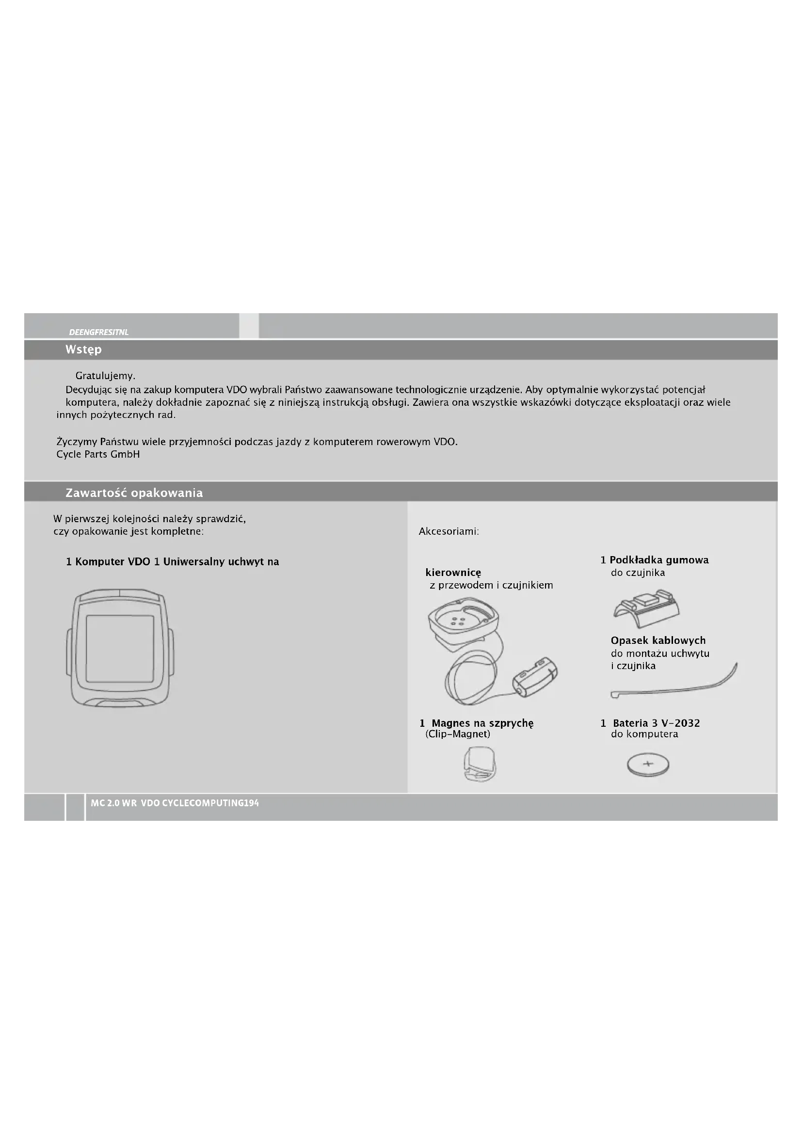 Cycle Parts GmbH LeQuartierHornbach13 67433Neustadt/Weinstrasse(Niemcy) W razie pytań technicznych jesteśmy do dyspozycji w standardowych godzinach pracy biura pod następującym numerem infolinii: +49 (0) 63 21- 95 82 7 - 10 +49 (0) 63 21- 95 82 7 - 18 Więcejinformacjitechnicznychmożnauzyskaćnastronie: www.vdocyclecomputing.com Wtokudalszegorozwojurmazastrzegasobieprawodozmian technicznych. VDOCyclePartszapewnia3-letniągwarancjęnakomputerVDO liczonąoddatykupna.Gwarancjaobejmujewadymateriału,błędy przyprzetwarzaniudanychwkomputerze,czujnikach/nadajnikach iuchwycienakierownicę.Kabelibaterie,atakżemateriałysłużące domontażu,niesąobjętegwarancją.Gwarancjajestważnajedynie wtedy,gdyczęści,którychonadotyczy,niebyłyotwierane(wyjątek: komoranabateriekomputera),nieużytosiłyaniniedoszłodo celowegouszkodzenia. Należyzachowaćdowódzakupu,abywraziereklamacjimócgo przedłożyć. Wrazieuprawnionejreklamacjiklientotrzymaodnasporównywalny sprzętwymienny.Prawodozastąpieniakomputeramodelem identycznymnieprzysługuje,jeśliwwynikuzmianymodeli produkcjareklamowanegomodeluzostaławstrzymana.Zwszelkimi reklamacjaminależyzwracaćsiędopunktuhandlowego,wktórym urządzeniezostałokupione.Reklamacjęmożnatakżeprzesłać bezpośredniodoproducenta:ITNLPL FRES ENG DE www.vdocyclecomputing.com MC 2.0 WR 223