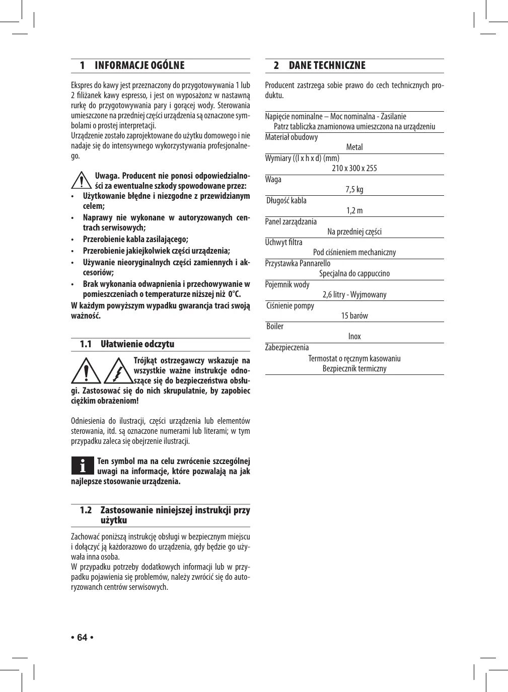 1 INFORMACJE OGÓLNE Ekspres do kawy jest przeznaczony do przygotowywania 1 lub 2 filiżanek kawy espresso, i jest on wyposażonz w nastawną rurkę do przygotowywania pary i gorącej wody. Sterowania umieszczone na przedniej części urządzenia są oznaczone symbolami o prostej interpretacji. Urządzenie zostało zaprojektowane do użytku domowego i nie nadaje się do intensywnego wykorzystywania profesjonalnego. Uwaga. Producent nie ponosi odpowiedzialności za ewentualne szkody spowodowane przez: • Użytkowanie błędne i niezgodne z przewidzianym celem; • Naprawy nie wykonane w autoryzowanych centrach serwisowych; • Przerobienie kabla zasilającego; • Przerobienie jakiejkolwiek części urządzenia; • Używanie nieoryginalnych części zamiennych i akcesoriów; • Brak wykonania odwapnienia i przechowywanie w pomieszczeniach o temperaturze niższej niż 0°C. W każdym powyższym wypadku gwarancja traci swoją ważność.