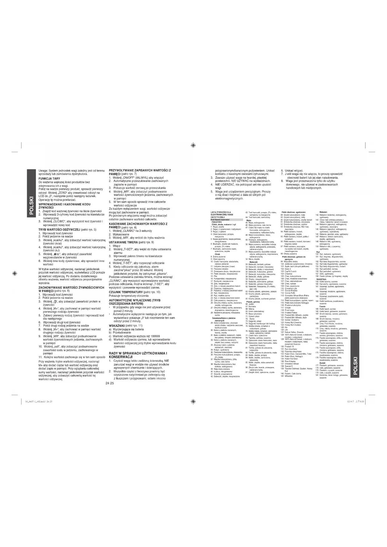 czyszczone natychmiast po zetknięciu się z tłuszczem i przyprawami, octem i mocno ELEKTRONICZNEJ WAGI 1 Rogal, zwykły2 Rogal, z cynamonem i rodzynkami3 Rogal, z jajkiem4 Chleb bananowy, przepis, margaryna5 Kasza jęczmienna, kasza perłowa, nieugotowana6 Biszkopty, zwykłe lub maślane, przepis, 2% mleka7 Biszkopty, zamrożone ciasto, upieczone, zwykłe Chleb8 Ziarno pszenne9 Chleb jajeczny10 Ciasto francuskie, wiedeńskie, zakwas piekarski11 Indyjskie pieczywo (naan)12 Pieczywo włoskie13 Zmieszane zboża, nieopieczone14 Płatki owsiane, nieopieczone15 Pita16 Pumpernikiel, nieopieczony17 Rodzynki, nieopieczone18 Żyto, nieopieczone19 Żyto, o niższej zawartości kalorii20 Pszenica, nieopieczona21 Pszenica, o niższej zawartości kalorii22 Ryż, nieopieczony23 Ryż, miękkie ziarna24 Ryż, o niższej zawartości kalorii25 Cała pszenica, nieopieczona 26 Okruchy chleba, suche, zacierane, zwykłe, wzbogacone27 Okruchy chleba, suche, zacierane, doprawione, niewzbogacone28 Nadzienie pieczywa, mieszanka sucha 29 Baton śniadaniowy, zbożowe skórki chleba, nadzienie owocowe, beztłuszczowe30 Baton z płatków owsianych, twardy, zwykły31 Baton z płatków owsianych, miękki, bez polewy, chrupek czekoladowy32 Baton z płatków owsianych, miękki, bez polewy, rodzynki33 Zbożowy baton z płatków owsianych, owocowy34 Bulgur, ugotowany35 Pieczywo kukurydziane, mieszanka36 Pieczywo kukurydziane, przepis, 2% mleko37 Mączka kukurydziana, żółta, sucha, całe ziarna38 Mączka kukurydziana, bez kiełków, wzbogacona39 Mąka kukurydziana40 Kuskus, nieugotowany41 Grzanki, przyprawione42 Babeczki, zwykłe, nieupieczone43 Tost francuski, przepis, 2% mleko, usmażony na margarynie44 Tost francuski, zamrożony 45 Mąka, wzbogacona46 Mąka gryczana, całe ziarna47 Ciasto lub mąka na ciasto francuskie, wzbogacona, nieprzesiana, nakładana łyżką48 Mąka kukurydziana, masa, wzbogacona49 Rosnące, wzbogacone, nieprzesiane, nabierane łyżką50 Mąka pszenna, wszystkie rodzaje użycia, wzbogacona, przesiana, nabierana łyżką51 Mąka pszenna, wszystkie rodzaje użycia, wzbogacona, nieprzesiana, nabierana łyżką52 Maca, zwykła Babeczki53 Babeczki, borówki, gotowe54 Babeczki, borówki, mieszanka55 Babeczki, otręby z rodzynkami56 Babeczki, Kukurydza, gotowe57 Babeczki, kukurydza, mieszanka58 Babeczki, otręby, gotowe59 Otręby, nieugotowane60 Naleśniki, zamrożone, gotowe61 Naleśniki, gotowa mieszanka62 Naleśniki, mieszanka, 2% mleko, jaja i olej63 Kruchy placek, upieczony, przepis64 Kruchy placek, upieczony, zamrożony65 Kruchy placek, sucharek graham 66 Jabłko67 Borówka68 Wiśnia69 Krem czekoladowy70 Beza cytrynowa71 Orzech pikan72 Dynia73 Sajgonki, obiad74 Sajgonki, hamburger lub hotdog75 Słodka rolada, cynamon z rodzynkami, gotowe76 Słodka rolada, cynamon, zamrożone ciasto, upieczone z lukrem77 Ciasto taco, upieczone78 Tapioka, perłowa, suszona79 Opieczone ciasto francuskie, owoc80 Opieczone ciasto francuskie, niska zawartość tłuszczu81 Tortilla, gotowa do pieczenia, kukurydza82 Tortilla, gotowa do pieczenia, mąka83 Wae, zwykłe, przepis84 Wae, zwykłe, zamrożone, opieczone85 Wae, zwykłe, niska zawartość tłuszczu86 Zboża całe; twarde, zmieszane, nabierane łyżką87 Zalążki zbóż, opieczone, czyste 88 Grysik kukurydziany, biały89 Grysik kukurydziany, żółty90 Grysik kukurydziany, zwykły instant91 Śmietanka zbożowa, zwyczajna92 Śmietanka zbożowa, szybka93 Śmietanka zbożowa, Mix‘n‘eat, zwyczajna94 Płatki owsiane, instant, wzbogacone, zwykłe95 Płatki owsiane, instant, jabłka i cynamom96 Płatki owsiane, instant, klonowe i brązowy cukier97 Płatki owsiane, zwyczajne, na szybko lub instant, zwykłe, niewzbogacone98 Otręby pszenne 99 Wszystkie otręby100 Jabłkowo-cynamonowe, Cheerios101 Apple Jack (chrupki jabłkowe)102 Basic 4103 Cap‘N Crunch104 Cheerios105 Chex, kukurydziane106 Chex, miodowo-orzechowe107 Chex, wielootrębowe108 Chex, ryżowe109 Chex, pszeniczne110 Cinnamon Life111 Cocoa Krispies112 Cocoa Puffs113 Complete Wheat Bran (Pełne płatki pszeniczno-otrębowe)114 Płatki kukurydziane, ogólnie, razem115 Płatki kukurydziane Kellogg‘s116 Prażona kukurydza117 Crispix118 Froot loops119 Frosted Flakes120 Frosted Mini Wheats, zwykłe121 Frosted Mini Wheats, duże122 Golden Grahams123 Honey Nut Cheerios124 Honey Nut Clusters125 Kix126 Life127 Nature Valley, Granola128 100% Natural Cereal, z otrębami, miodem i rodzynkami129 100% Natural Cereal, z otrębami, miodem i rodzynkami, niska zawartość tłuszczu130 Product 19131 Ryż dmuchany132 Pszenica dmuchana133 Raisin Bran, General Mills, Total134 Raisin Bran, Kellogg‘s135 Raisin Nut Bran136 Rice Krispies137 Shredded Wheat138 Special K139 Toasted Oatmeal, Quaker, Honey Nut 140 Razem, Całe ziarna141 Wheaties Makaron142 Makaron (kolanka), wzbogacony, ugotowany143 Chow mein (chińska potrawa z mięsa, makaronu i jarzyn) w puszce144 Makaron (jajeczny), wzbogacony, ugotowany, zwyczajny145 Makaron (jajeczny), wzbogacony, ugotowany, szpinakowy146 Makaron, japoński, soba, ugotowany147 Makaron, świeżo zamrożony, zwykły, ugotowany148 Makaron nitki, ugotowany, wzbogacony159 Makaron nitki, z pszenicy, ugotowany 150 Ryż, makaron, ugotowany151 Ryż, brązowy, długoziarnisty, ugotowany152 Ryż biały długoziarnisty, surowy153 Ryż biały długoziarnisty, ugotowany154 Ryż biały długoziarnisty, instant155 Ryż parboiled, surowy156 Ryż parboiled, ugotowany157 Dziki, ugotowany158 Ciasto ryżowe, ryż brązowy, zwykły 159 Kiełki lucerny, surowe160 Karczochy, ugotowane, suszone161 Szparagi, surowe, ugotowane, suszone162 Szparagi, mrożone, ugotowane, suszone163 Szparagi, puszkowane, pędy, suszone164 Kiełki bambusa, puszkowane, suszone Fasole165 Kiełki fasoli, surowe166 Kiełki fasoli, gotowane, suszone167 Groch beżowy, surowy, gotowany, suszony168 Groch beżowy, mrożony, gotowany, suszony169 Lima, Ford Hooks, mrożone, gotowane, suszone170 Lima, młoda, mrożona, gotowana, suszona171 Fasola szpar