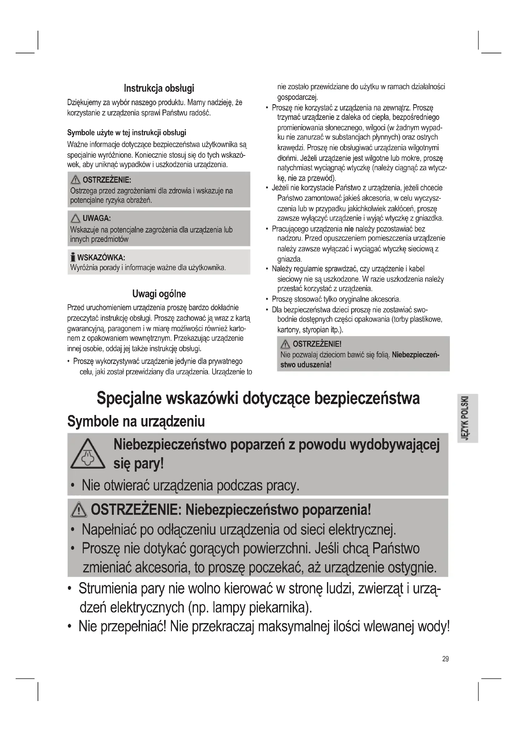 - Dla bezpieczeństwa dzieci proszę nie zostawiać swo- bodnie dostępnych części opakowania (torby plastikowe, kartony, styropian itp.). OSTRZEŻENIE! Nie pozwalaj dzieciom bawić się folią. Niebezpieczeń- stwo uduszenia! Specjalne wskazówki dotyczące bezpieczeństwa Symbole na urządzeniu Niebezpieczeństwo poparzeń z powodu wydobywającej się pary!