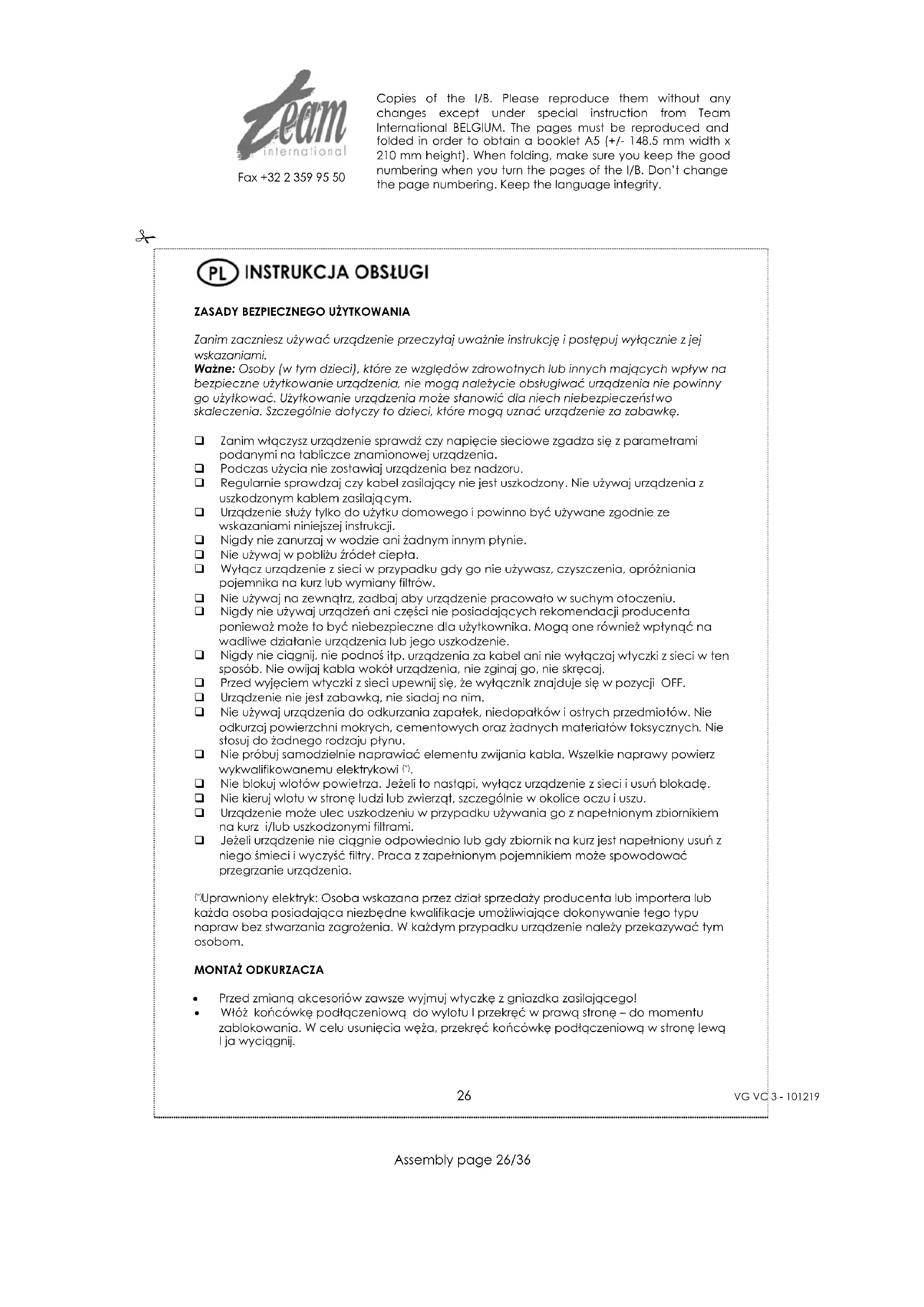 - Włóż końcówkę podłączeniową do wylotu I przekręć w prawą stronę – do momentu zablokowania. W celu usunięcia węża, przekręć końcówkę podłączeniową w stronę lewą I ja wyciągnij. 26 VG VC 3 - 101219