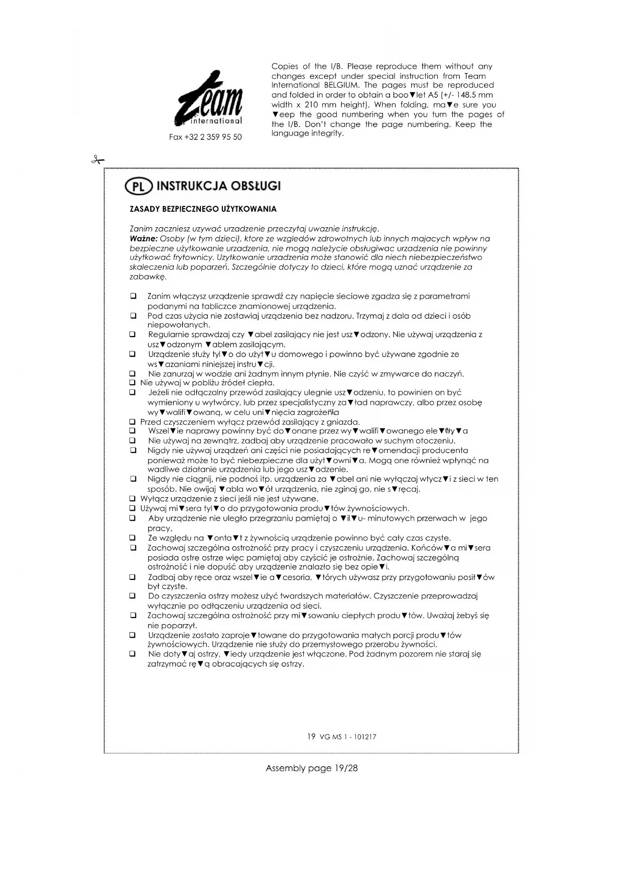 ZASADY BEZPIECZNEGO UśYTKOWANIA Zanim zaczniesz uzywać urzadzenie przeczytaj uwaznie instrukcję. WaŜne: Osoby (w tym dzieci), ktore ze wzgledów zdrowotnych lub innych majacych wpływ na bezpieczne uŜytkowanie urzadzenia, nie mogą naleŜycie obsługiwac urzadzenia nie powinny uŜytkować frytownicy. Uzytkowanie urzadzenia moŜe stanowić dla niech niebezpieczeństwo skaleczenia lub poparzeń. Szczególnie dotyczy to dzieci, które mogą uznać urządzenie za zabawkę. Zanim włączysz urządzenie sprawdź czy napięcie sieciowe zgadza się z parametrami podanymi na tabliczce znamionowej urządzenia. Pod czas uŜycia nie zostawiaj urządzenia bez nadzoru. Trzymaj z dala od dzieci i osób niepowołanych. Regularnie sprawdzaj czy kabel zasilający nie jest uszkodzony. Nie uŜywaj urządzenia z uszkodzonym kablem zasilającym. Urządzenie słuŜy tylko do uŜytku domowego i powinno być uŜywane zgodnie ze wskazaniami niniejszej instrukcji. Nie zanurzaj w wodzie ani Ŝadnym innym płynie. Nie czyść w zmywarce do naczyń. Nie uŜywaj w pobliŜu źródeł ciepła. JeŜeli nie odłączalny przewód zasilający ulegnie uszkodzeniu, to powinien on być wymieniony u wytwórcy, lub przez specjalistyczny zakład naprawczy, albo przez osobę wykwalifikowaną, w celu uniknięcia zagroŜenia