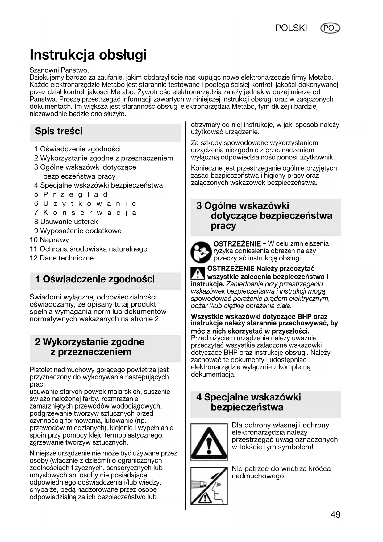 POL 1 Oświadczenie zgodności 2 Wykorzystanie zgodne z przeznaczeniem 3 Ogólne wskazówki dotyczące bezpieczeństwa pracy 4 Specjalne wskazówki bezpieczeństwa 5Przegląd 6Użytkowanie 7Konserwacja 8 Usuwanie usterek 9 Wyposażenie dodatkowe 10 Naprawy 11 Ochrona środowiska naturalnego 12 Dane techniczne Świadomi wyłącznej odpowiedzialności oświadczamy, że opisany tutaj produkt spełnia wymagania norm lub dokumentów normatywnych wskazanych na stronie 2. Pistolet nadmuchowy gorącego powietrza jest przyznaczony do wykonywania następujących prac: usuwanie starych powłok malarskich, suszenie świeżo nałożonej farby, rozmrażanie zamarzniętych przewodów wodociągowych, podgrzewanie tworzyw sztucznych przed czynnością formowania, lutowanie (np. przewodów miedzianych), klejenie i wypełnianie spoin przy pomocy kleju termoplastycznego, zgrzewanie tworzyw sztucznych. Niniejsze urządzenie nie może być używane przez osoby (włącznie z dziećmi) o ograniczonych zdolnościach fizycznych, sensorycznych lub umysłowych ani osoby nie posiadające odpowiedniego doświadczenia i/lub wiedzy, chyba że, będą nadzorowane przez osobę odpowiedzialną za ich bezpieczeństwo lub otrzymały od niej instrukcje, w jaki sposób należy użytkować urządzenie. Za szkody spowodowane wykorzystaniem urządzenia niezgodnie z przeznaczeniem wyłączną odpowiedzialność ponosi użytkownik. Konieczne jest przestrzeganie ogólnie przyjętych zasad bezpieczeństwa i higieny pracy oraz załączonych wskazówek bezpieczeństwa. OSTRZEŻENIE – W celu zmniejszenia ryzyka odniesienia obrażeń należy przeczytać instrukcję obsługi. OSTRZEŻENIE Należy przeczytać wszystkie zalecenia bezpieczeństwa i instrukcje. Zaniedbania przy przestrzeganiu wskazówek bezpieczeństwa i instrukcji mogą spowodować porażenie prądem elektrycznym, pożar i/lub ciężkie obrażenia ciała. Wszystkie wskazówki dotyczące BHP oraz instrukcje należy starannie przechowywać, by móc z nich skorzystać w przyszłości. Przed użyciem urządzenia należy uważnie przeczytać wszystkie załączone wskazówki dotyczące BHP oraz instrukcję obsługi. Należy zachować te dokumenty i udostępniać elektronarzędzie wyłącznie z kompletną dokumentacją. Dla ochrony własnej i ochrony elektronarzędzia należy przestrzegać uwag oznaczonych w tekście tym symbolem! Nie patrzeć do wnętrza króćca nadmuchowego! Instrukcja obsługi Szanowni Państwo, Dziękujemy bardzo za zaufanie, jakim obdarzyliście nas kupując nowe elektronarzędzie firmy Metabo. Każde elektronarzędzie Metabo jest starannie testowane i podlega ścisłej kontroli jakości dokonywanej przez dział kontroli jakości Metabo. Żywotność elektronarzędzia zależy jednak w dużej mierze od Państwa. Proszę przestrzegać informacji zawartych w niniejszej instrukcji obsługi oraz w załączonych dokumentach. Im większa jest staranność obsługi elektronarzędzia Metabo, tym dłużej i bardziej niezawodnie będzie ono służyło. Spis treści 1 Oświadczenie zgodności 2 Wykorzystanie zgodne z przeznaczeniem 3 Ogólne wskazówki dotyczące bezpieczeństwa pracy 4 Specjalne wskazówki bezpieczeństwa 17024612_0409 HE 2300 HE 2000 H 1600.book Seite 49 Dienstag, 16. Juni 2009 11:40 1150 POLSKI POL Pistoletu nadmuchowego gorącego powietrza nie należy kierować na materiały łatwopalne! Niestrożne wykorzystanie pistoletu nadmuchowego grozi pożarem. Pistoletu nadmuchowego gorącego powietrza nie należy używać do suszenia włosów! W czasie pracy należy stale nosić okulary ochronne i rękawice robocze! Przy wykorzystaniu pistoletu nadmuchowego gorącego powietrza w pobliżu palnych materiałów lub wybuchowych gazów należy zachować ostrożność. Strumień gorącego powietrza nie powinien być kierowany zbyt długo w jedno miejsce! Ciepło może ulec przeniesieniu na materiały palne, pozostające poza zasięgiem wzroku. Pistolet nadmuchowy gorącego powietrza należy użytkować wyłącznie w dobrze przewietrzanych pomieszczeniach! Nie należy wdychać wydzielających się par! Włączonego pistoletu nadmuchowego gorącego powietrza nie wolno pozostawiać bez nadzoru. Po zakończeniu pracy należy ustawić pistolet nadmuchowy na powierzchniach podporowych i pozostawić do ochłodzenia przed umieszczeniem w miejscu przechowywania! Groźba oparzenia: Nie dotykać gorącego króćca nadmuchowego
