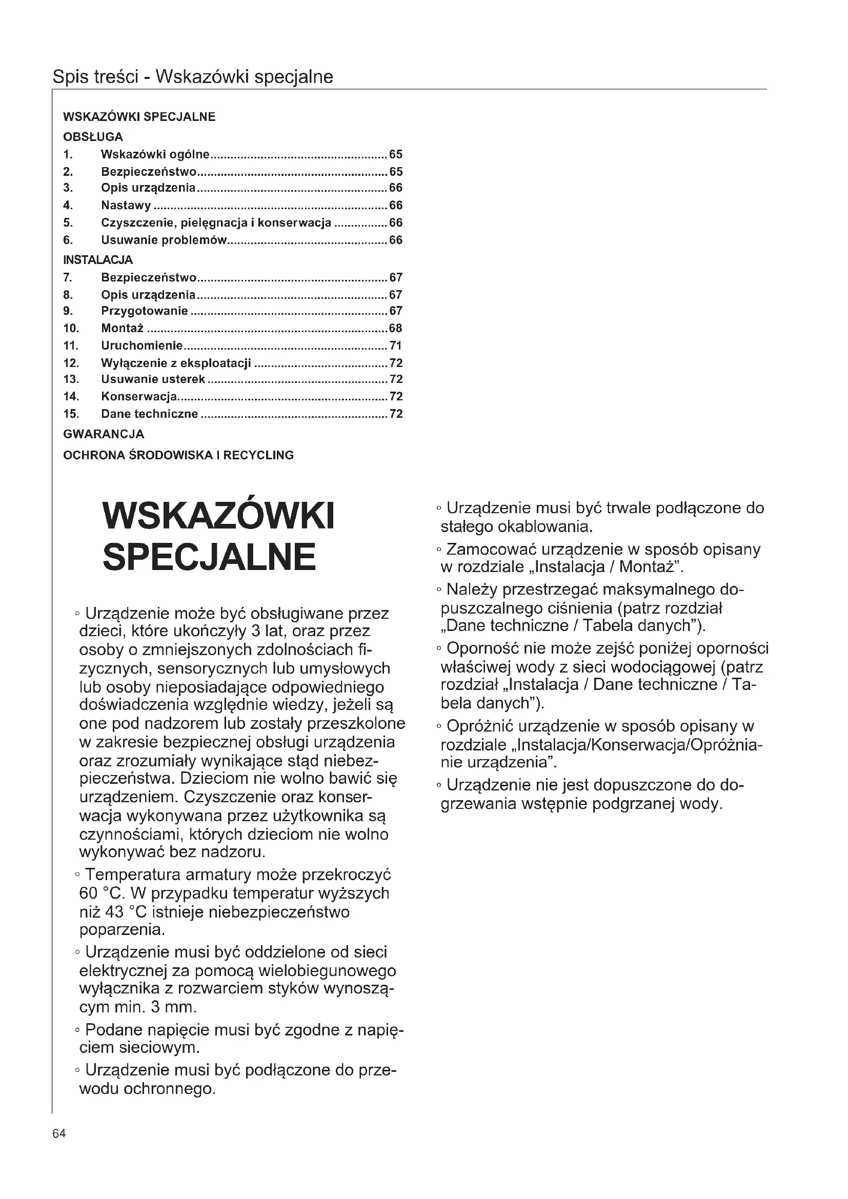 - Urządzenie nie jest dopuszczone do do- grzewania wstępnie podgrzanej wody.65 Obsługa OBSŁUGA