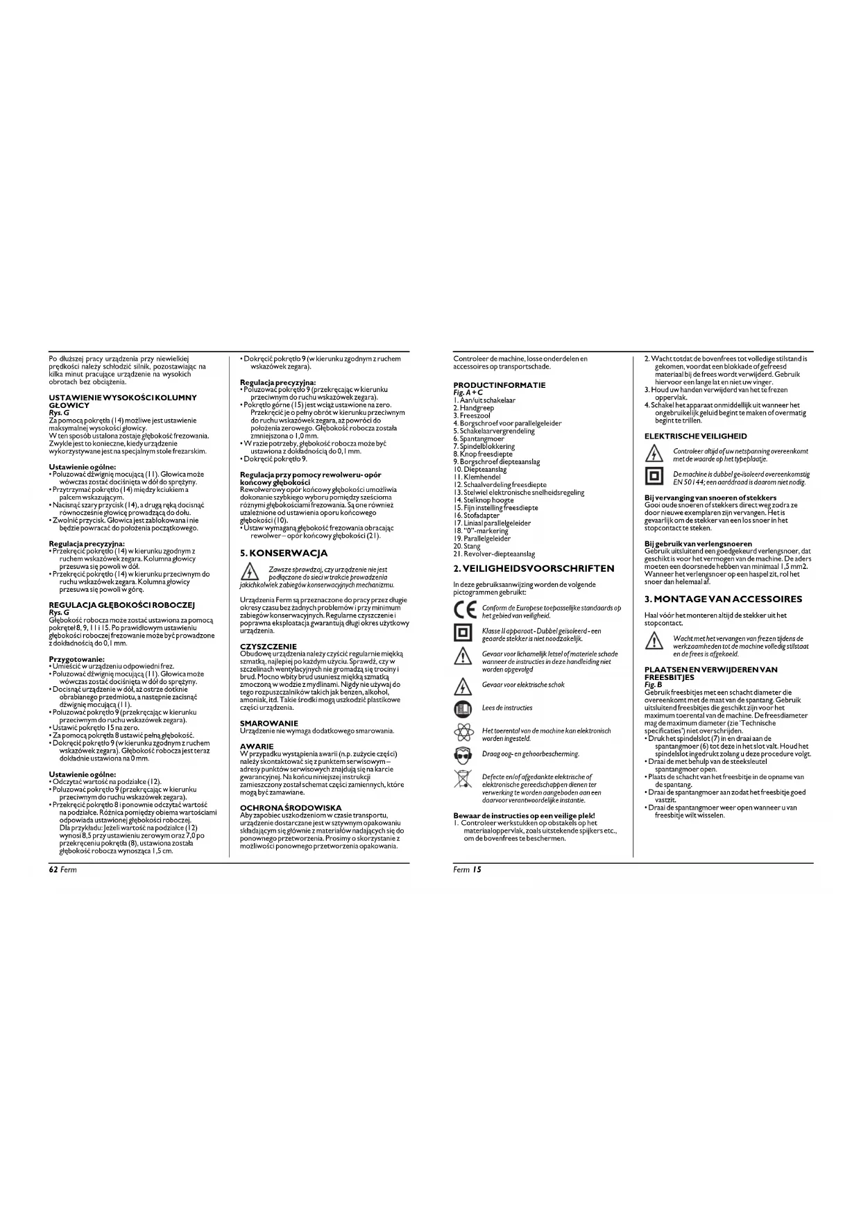 - Draai de spantangmoer weer open wanneer u van freesbitje wilt wisselen. Ferm 15 Po dłuższej pracy urządzenia przy niewielkiej prędkości należy schłodzić silnik, pozostawiając na kilka minut pracujące urządzenie na wysokich obrotach bez obciążenia.