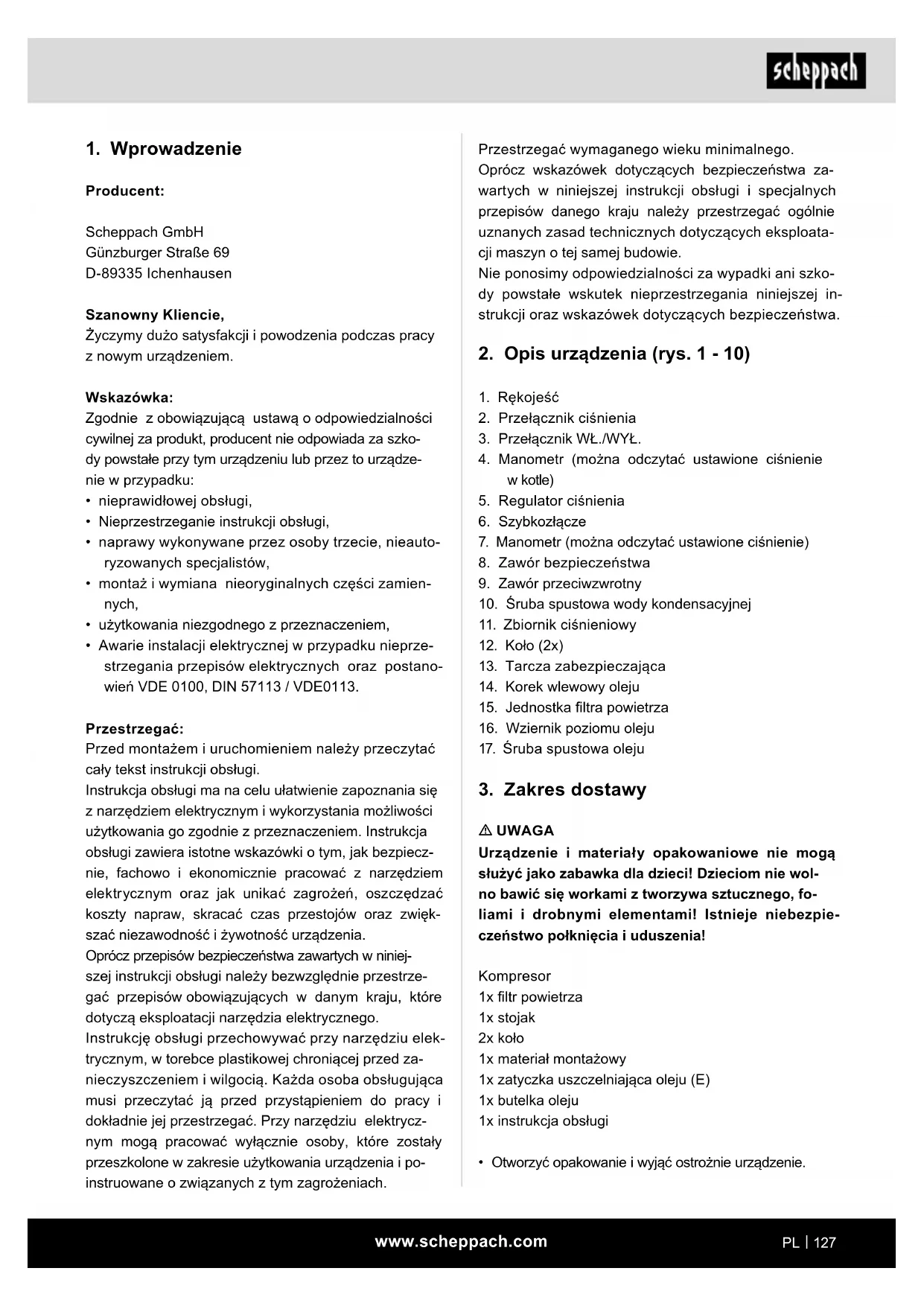 Producent: Scheppach GmbH Günzburger Straße 69 D-89335 Ichenhausen Szanowny Kliencie, Życzymy dużo satysfakcji i powodzenia podczas pracy z nowym urządzeniem. Wskazówka: Zgodnie z obowiązującą ustawą o odpowiedzialności cywilnej za produkt, producent nie odpowiada za szko- dy powstałe przy tym urządzeniu lub przez to urządze- nie w przypadku: