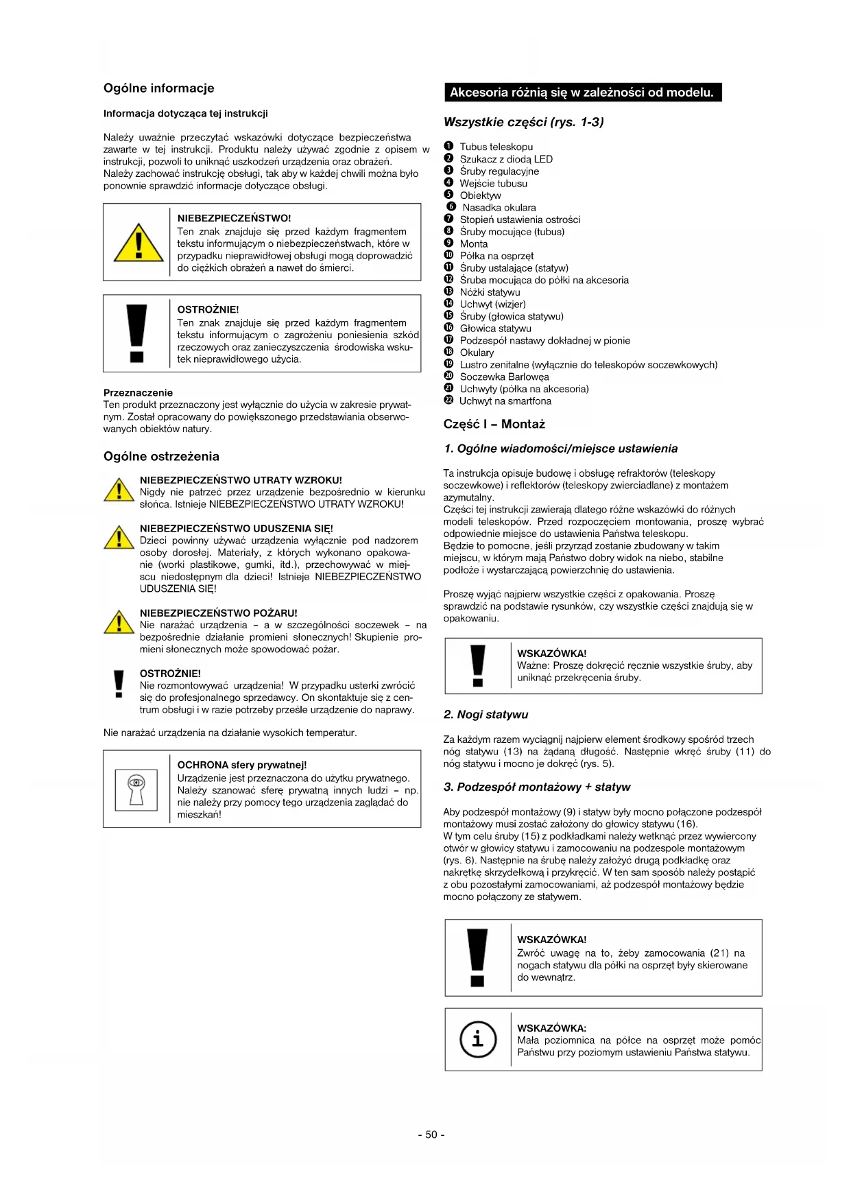 Ta instrukcja opisuje budowę i obsługę refraktorów (teleskopy soczewkowe) i reflektorów (teleskopy zwierciadlane) z montażem azymutalny. Części tej instrukcji zawierają dlatego różne wskazówki do różnych modeli teleskopów. Przed rozpoczęciem montowania, proszę wybrać odpowiednie miejsce do ustawienia Państwa teleskopu. Będzie to pomocne, jeśli przyrząd zostanie zbudowany w takim miejscu, w którym mają Państwo dobry widok na niebo, stabilne podłoże i wystarczającą powierzchnię do ustawienia. Proszę wyjąć najpierw wszystkie części z opakowania. Proszę sprawdzić na podstawie rysunków, czy wszystkie części znajdują się w opakowaniu. WSKAZÓWKA! Ważne: Proszę dokręcić ręcznie wszystkie śruby, aby uniknąć przekręcenia śruby.