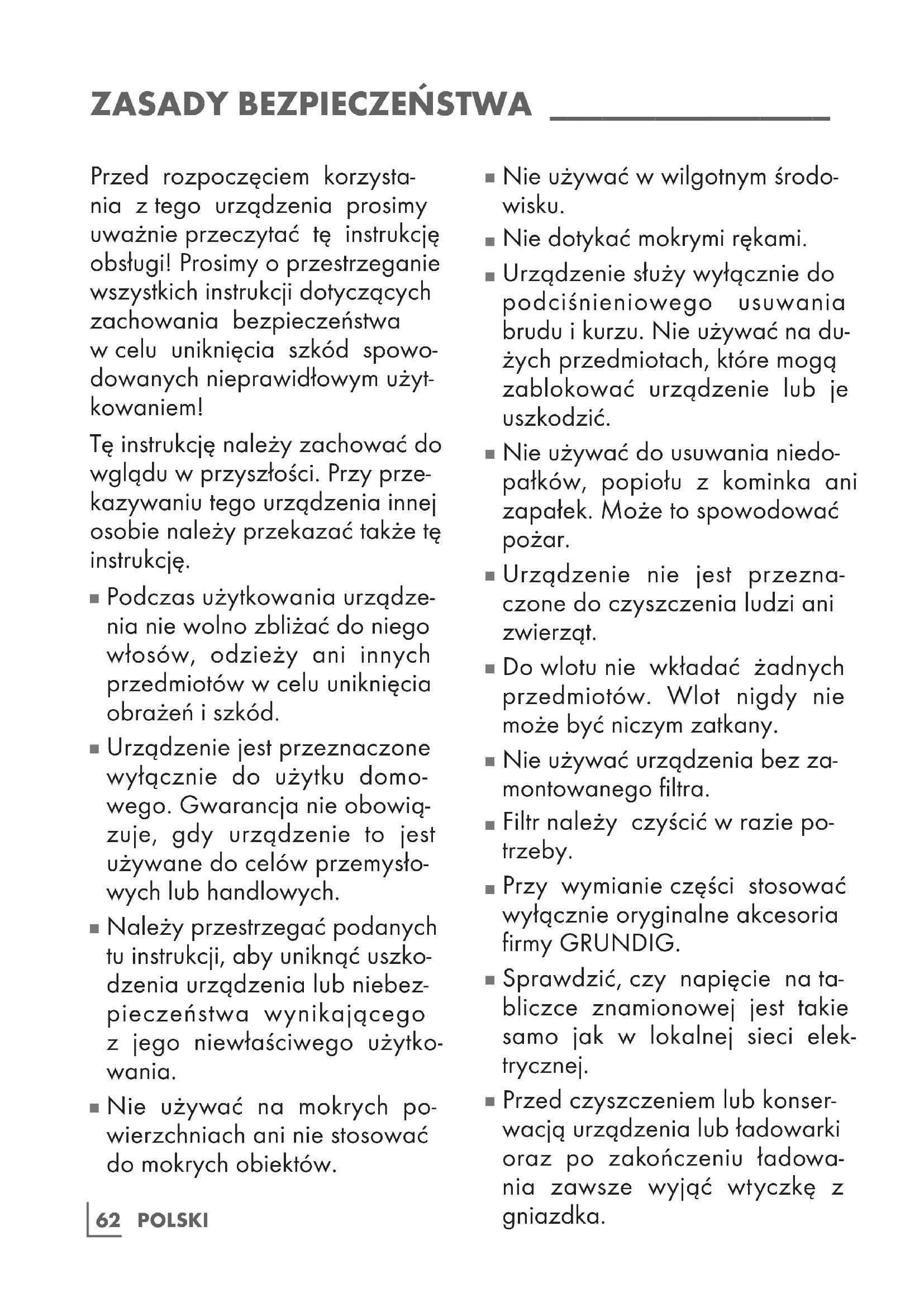 Artykuły gospodarstwa domo- wego firmy GRUNDIG spełniają wszystkie wymogi stosownych norm bezpieczeństwa. W przy- padku uszkodzenia urządzenia lub przewodu zasilania, aby unik- nąć zagrożenia, należy oddać je do wymiany przez sprzedawcę, punkt serwisowy lub podobnie wykwalifikowaną i upoważnioną osobę. Niewłaściwie wykonana lub niefachowa naprawa może powodować zagrożenie dla użyt- kowników.