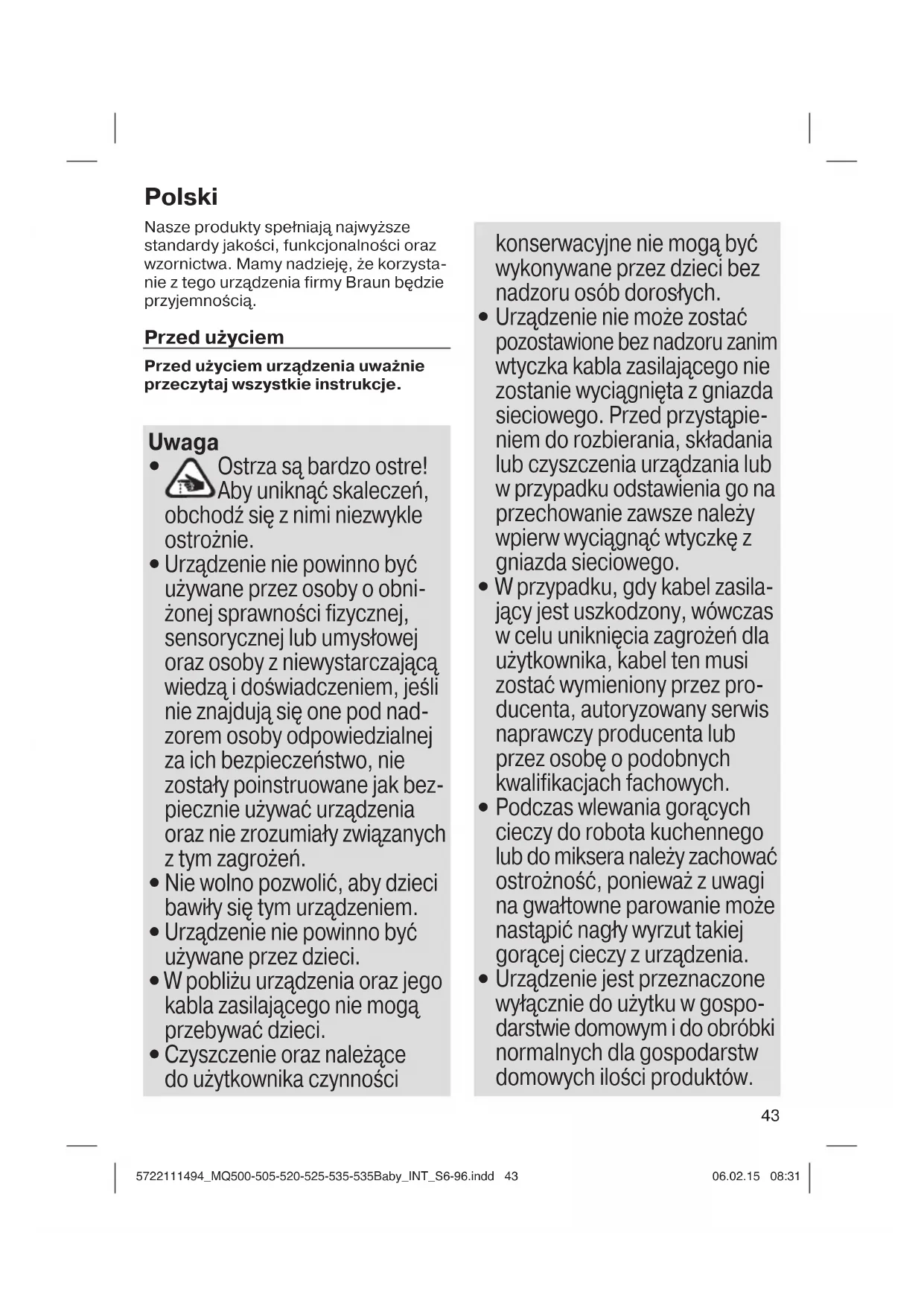 Urządzenie jest przeznaczone wyłącznie do użytku w gospo- darstwie domowym i do obróbki normalnych dla gospodarstw domowych ilości produktów. Polski 5722111494_MQ500-505-520-525-535-535Baby_INT_S6-96.indd 435722111494_MQ500-505-520-525-535-535Baby_INT_S6-96.indd 43 06.02.15 08:3106.02.15 08:3144