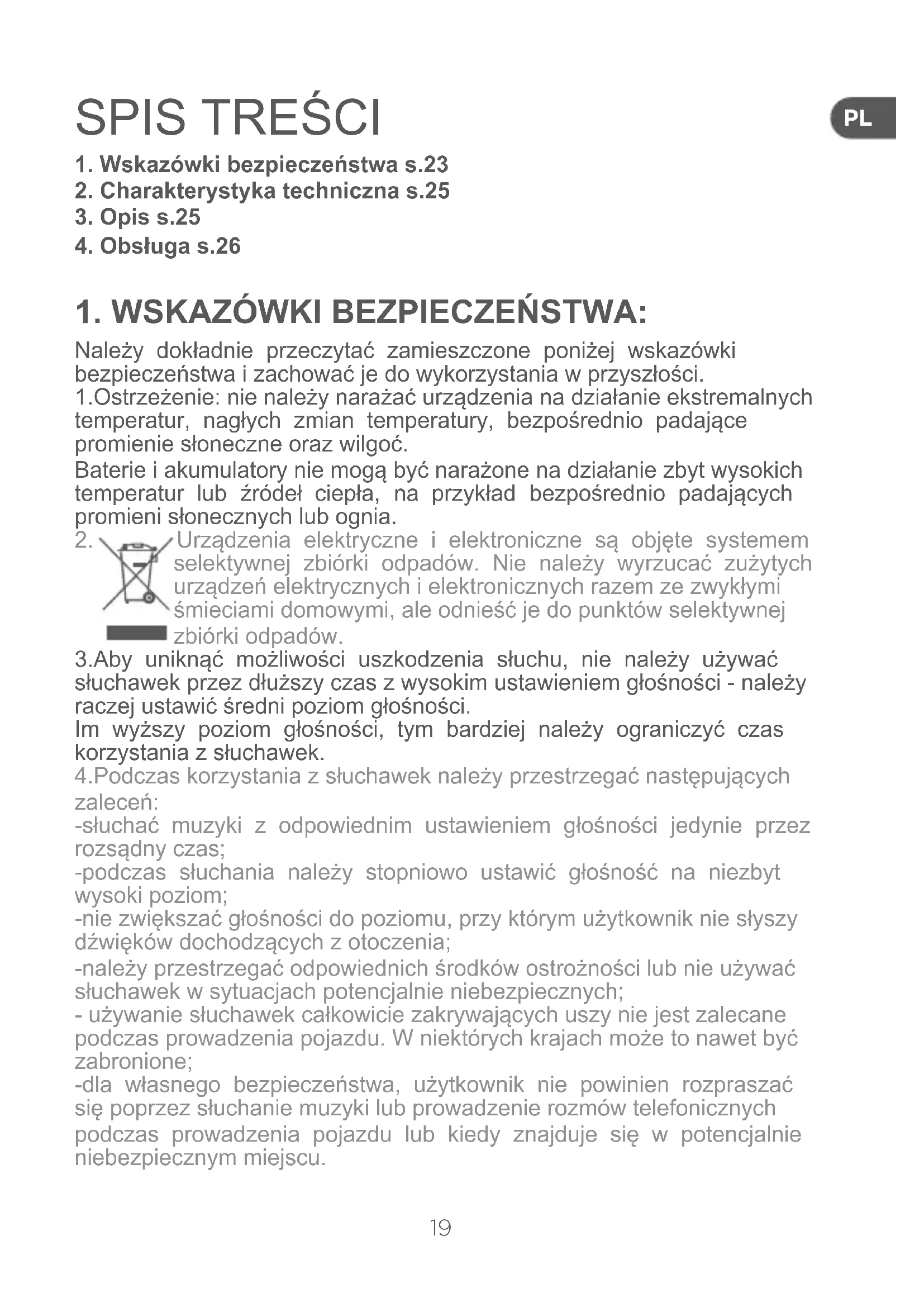 Urządzenia elektryczne i elektroniczne są objęte systemem selektywnej zbiórki odpadów. Nie należy wyrzucać zużytych urządzeń elektrycznych i elektronicznych razem ze zwykłymi śmieciami domowymi, ale odnieść je do punktów selektywnej zbiórki odpadów. 3.Aby uniknąć możliwości uszkodzenia słuchu, nie należy używać słuchawek przez dłuższy czas z wysokim ustawieniem głośności - należy raczej ustawić średni poziom głośności. Im wyższy poziom głośności, tym bardziej należy ograniczyć czas korzystania z słuchawek. 4.Podczas korzystania z słuchawek należy przestrzegać następujących zaleceń: -słuchać muzyki z odpowiednim ustawieniem głośności jedynie przez rozsądny czas; -podczas słuchania należy stopniowo ustawić głośność na niezbyt wysoki poziom; -nie zwiększać głośności do poziomu, przy którym użytkownik nie słyszy dźwięków dochodzących z otoczenia; -należy przestrzegać odpowiednich środków ostrożności lub nie używać słuchawek w sytuacjach potencjalnie niebezpiecznych; - używanie słuchawek całkowicie zakrywających uszy nie jest zalecane podczas prowadzenia pojazdu. W niektórych krajach może to nawet być zabronione; -dla własnego bezpieczeństwa, użytkownik nie powinien rozpraszać się poprzez słuchanie muzyki lub prowadzenie rozmów telefonicznych podczas prowadzenia pojazdu lub kiedy znajduje się w potencjalnie niebezpiecznym miejscu.PT