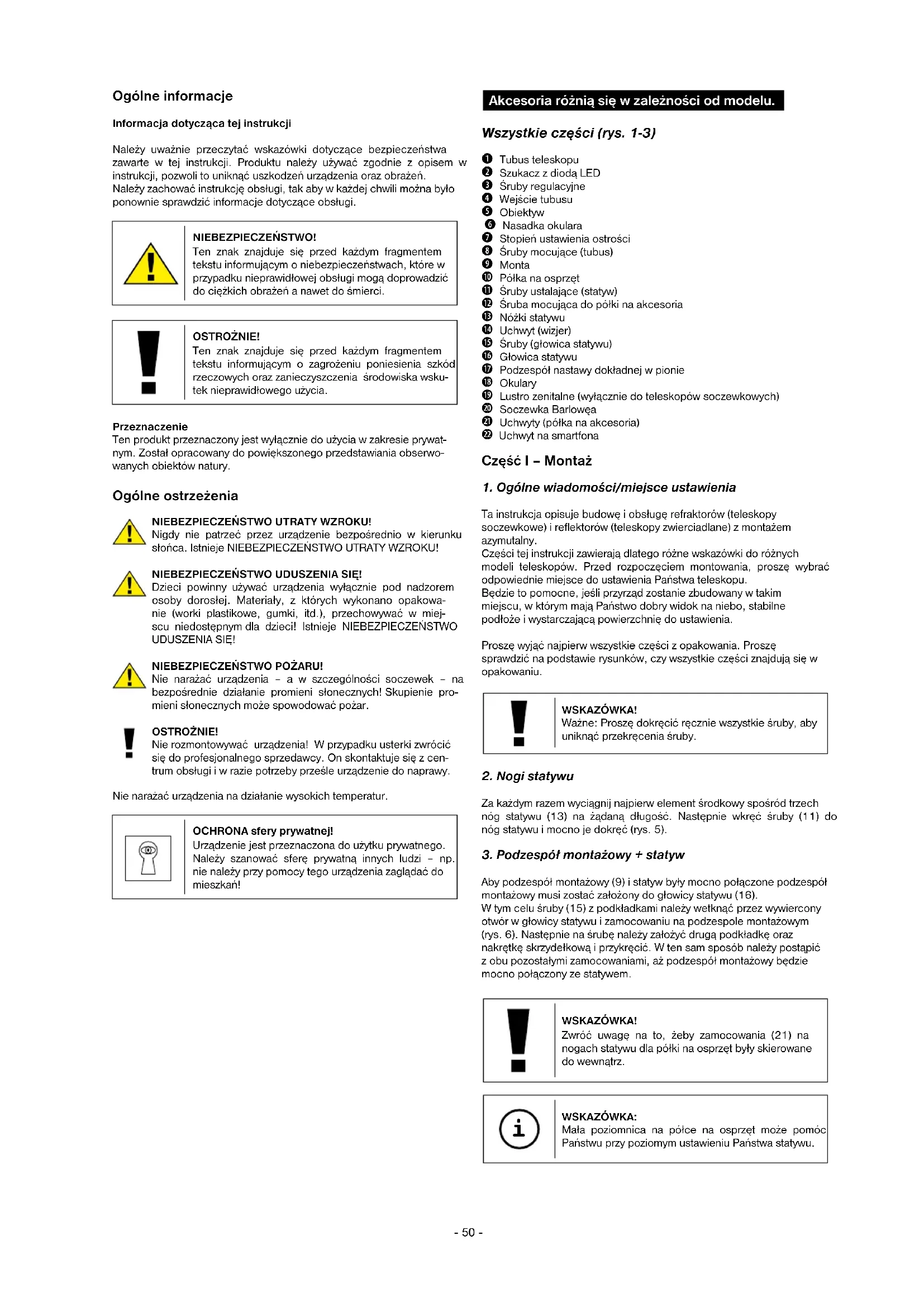 Ta instrukcja opisuje budowę i obsługę refraktorów (teleskopy soczewkowe) i reflektorów (teleskopy zwierciadlane) z montażem azymutalny. Części tej instrukcji zawierają dlatego różne wskazówki do różnych modeli teleskopów. Przed rozpoczęciem montowania, proszę wybrać odpowiednie miejsce do ustawienia Państwa teleskopu. Będzie to pomocne, jeśli przyrząd zostanie zbudowany w takim miejscu, w którym mają Państwo dobry widok na niebo, stabilne podłoże i wystarczającą powierzchnię do ustawienia. Proszę wyjąć najpierw wszystkie części z opakowania. Proszę sprawdzić na podstawie rysunków, czy wszystkie części znajdują się w opakowaniu. WSKAZÓWKA! Ważne: Proszę dokręcić ręcznie wszystkie śruby, aby uniknąć przekręcenia śruby.