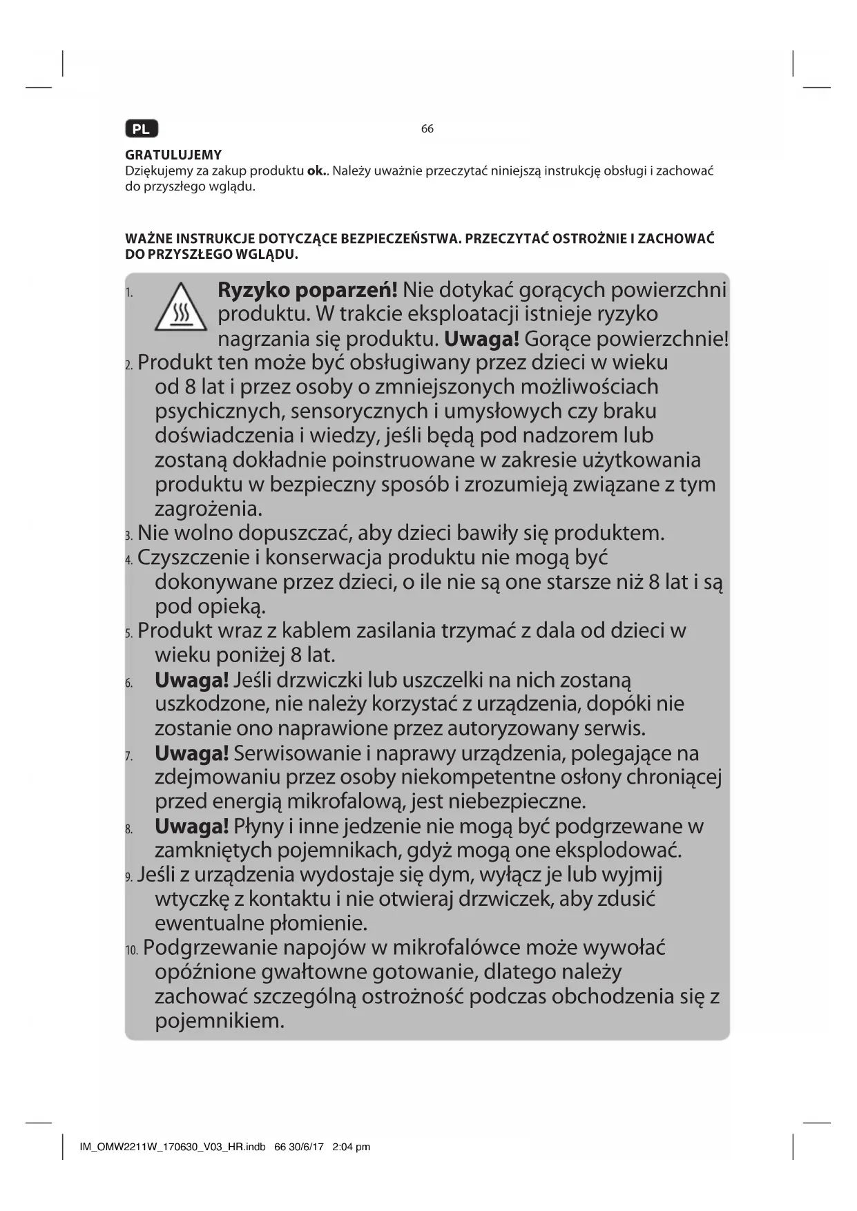 opóźnione gwałtowne gotowanie, dlatego należy zachować szczególną ostrożność podczas obchodzenia się z pojemnikiem. IM_OMW2211W_170630_V03_HR.indb 66 30/6/17 2:04 pm67
