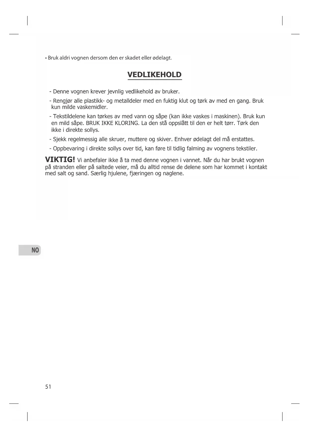 - Nigdy nie wolno podnosic wózka, chwytajac za fotelik samochodowy lub gondole; do podnoszenia uzywaj stelaz. KONSERWACJA - Wózek musi być regularnie sprawdzany przez użytkownika. - Metalowe i plastikowe części wózka należy czyścić za pomocą wilgotnej szmatki, a następnie wysuszyć. Stosować wyłącznie łagodne środki czyszczące. - Części wykonane z materiału można czyścić z użyciem wody(nie prać w pralce). Stosować wyłącznie łagodne środki piorące. Nie wybielać. Pozostaw do całkowitego wyschnięcia. Nie suszyć bezpośrednio na słońcu. - Regularnie sprawdzać śruby, nity i sworznie. Wymienić wszelkie zużyte części. - Długotrwałe wystawienie na działanie światła słonecznego może doprowadzić do wypłowienia części tekstylnych wózka. UWAGA! Nie zaleca się użytkować wózka nad morzem. Jeśli wózek był używany na plaży lub ośnieżonym/posypanym solą chodniku, należy każdorazowo przemywać części, które miały kontakt z solą lub piaskiem, zwłaszcza kółka, sprężyny i sworznie.INFORMACJE OGÓLNE