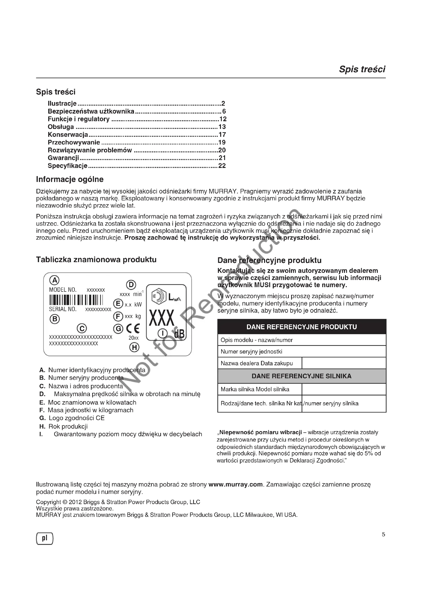 - Specyfi kacje Informacje ogólne Dziękujemy za nabycie tej wysokiej jakości odśnieżarki firmy MURRAY. Pragniemy wyrazić zadowolenie z zaufania pokładanego w naszą markę. Eksploatowany i konserwowany zgodnie z instrukcjami produkt firmy MURRAY będzie niezawodnie służyć przez wiele lat. Poniższa instrukcja obsługi zawiera informacje na temat zagrożeń i ryzyka związanych z odśnieżarkami i jak się przed nimi ustrzec. Odśnieżarka ta została skonstruowana i jest przeznaczona wyłącznie do odśnieżania i nie nadaje się do żadnego innego celu. Przed uruchomieniem bądź eksploatacją urządzenia użytkownik musi koniecznie dokładnie zapoznać się i zrozumieć niniejsze instrukcje. Proszę zachować tę instrukcję do wykorzystania w przyszłości. Dane referencyjne produktu Kontaktując się ze swoim autoryzowanym dealerem w sprawie części zamiennych, serwisu lub informacji użytkownik MUSI przygotować te numery. W wyznaczonym miejscu proszę zapisać nazwę/numer modelu, numery identyfikacyjne producenta i numery seryjne silnika, aby łatwo było je odnaleźć.DANE REFERENCYJNE PRODUKTUOpis modelu - nazwa/numerNumer seryjny jednostkiNazwa dealera Data zakupuDANE REFERENCYJNE SILNIKAMarka silnika Model silnikaRodzaj/dane tech. silnika Nr kat./numer seryjny silnika p. 22