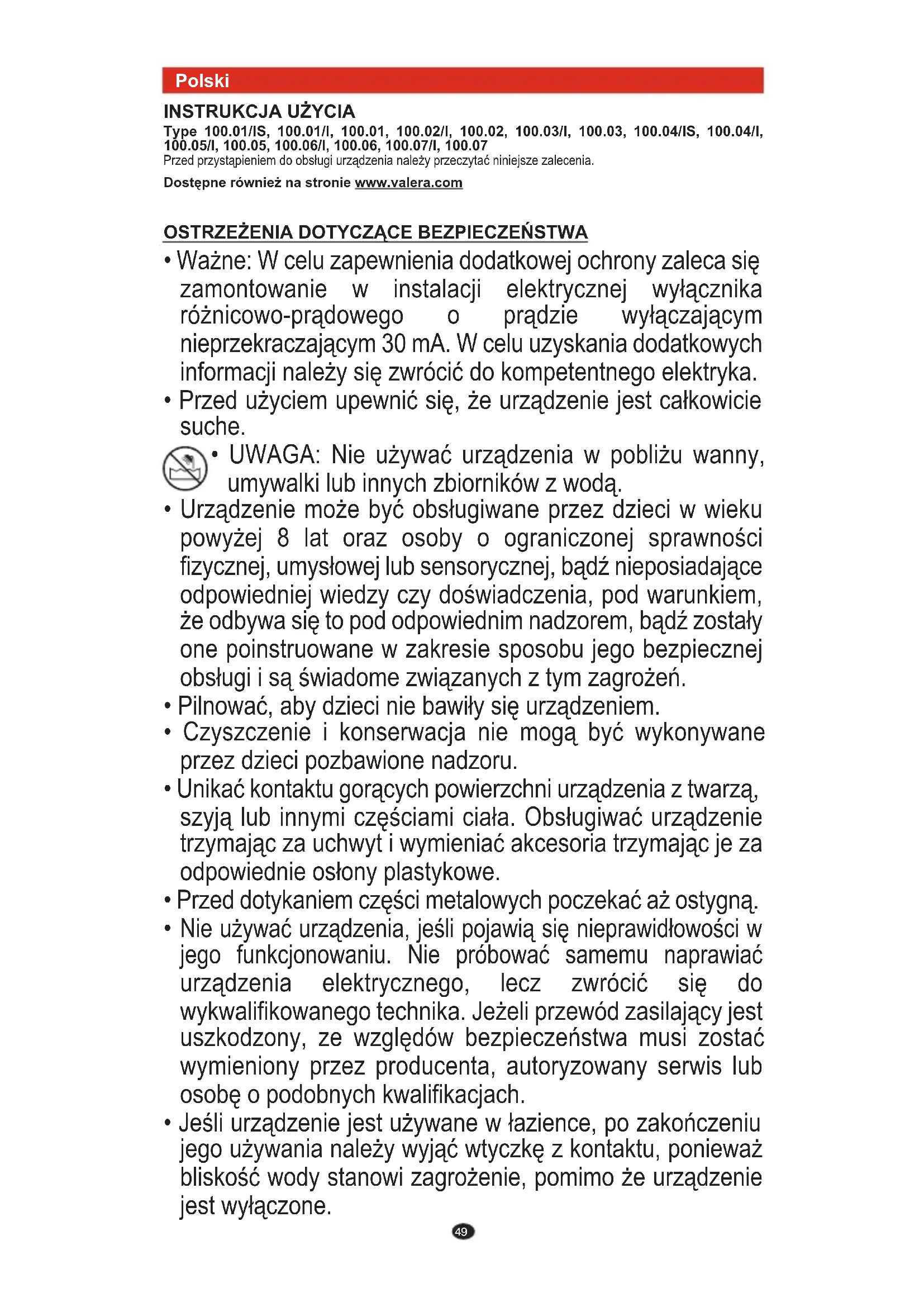 Type 100.01/IS, 100.01/I, 100.01, 100.02/I, 100.02, 100.03/I, 100.03, 100.04/IS, 100.04/I, 100.05/I, 100.05, 100.06/I, 100.06, 100.07/I, 100.07 Przed przystąpieniem do obsługi urządzenia należy przeczytać niniejsze zalecenia. Dostępne również na stronie www.valera.com
