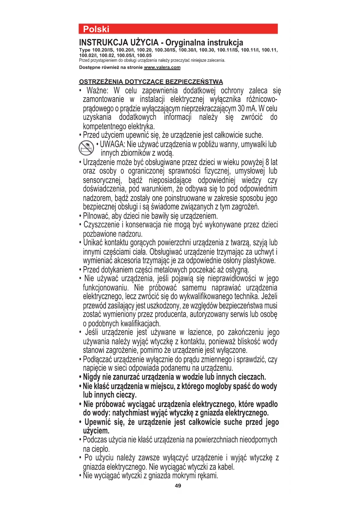 jeszcze ciepłe włosy, zamykając ich łuski i usuwając nadmiar ciepła, co pozwala utrwalić ich ułożenie. Zamontować nakładkę na urządzeniu, tak jak pokazano na rys. 2. Postępować zgodnie z instrukcjami pokazanymi na rys. 3 i 4. VALERA jest zastrzezonym znakiem towarowym firmy Ligo Electric SA - Szwajcaria symbol na produkcie lub opakowaniu oznacza, że tego produktu nie wolno traktować, tak jak innych odpadów domowych. Należy oddać go do właściwego punktu skupu surowców wtórnych zajmującego się złomowanym sprzętem elektrycznym i elektronicznym. Właściwa utylizacja i złomowanie pomaga w eliminacji niekorzystnego wpływu złomowanych produktów na naturalne środowisko oraz zdrowie. Aby uzyskać szczegółowe dane dotyczące możliwości recyklingu niniejszego urządzenia, należy skontaktować się z lokalnym Urzędem Miasta, służbami oczyszczania miasta lub sklepem, w którym produkt został zakupiony. 00060754 int_gen2018_Layout 1 22/01/2018 12:50 Pagina 5152 ΟΔΗΓΙΕΣ ΧΡΗΣΗΣ - Πρωτότυπες οδηγίες Τύπος 100.20/IS, 100.20/I, 100.20, 100.30/IS, 100.30/I, 100.30, 100.11/IS, 100.11/I, 100.11, 100.02/I, 100.02, 100.05/I, 100.05 Διαβάστε προσεκτικά τις οδηγίες αυτές πριν χρησιμοποιήσετε τη συσκευή. Τα προϊόντα είναι επίσης διαθέσιμα στην ιστοσελίδα www.valera.com ΟΔΗΓΊΕΣ ΑΣΦΑΛΕΊΑΣ