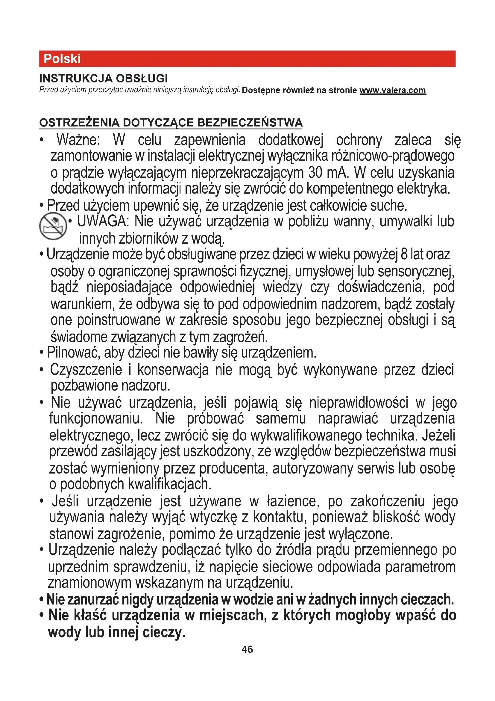 - UWAGA: Nie używać urządzenia w pobliżu wanny, umywalki lub innych zbiorników z wodą.