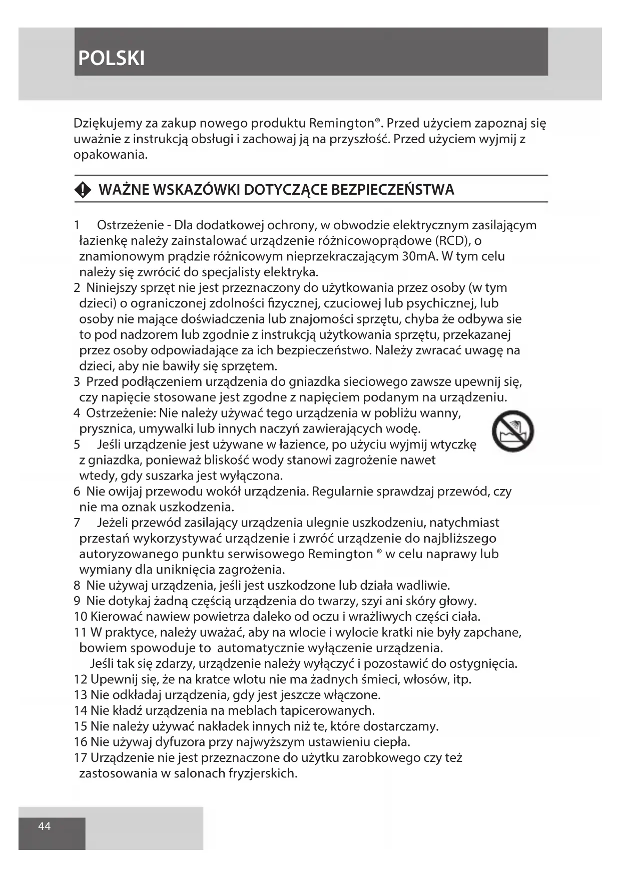 Dziekujemy za zakup nowego produktu Remington. Przed uzyciem zapoznaj są uwaznie z instrukcję obstugi i zachowaj ja na przyszłosc. Przed uzyciem wyjmij z opakowania.