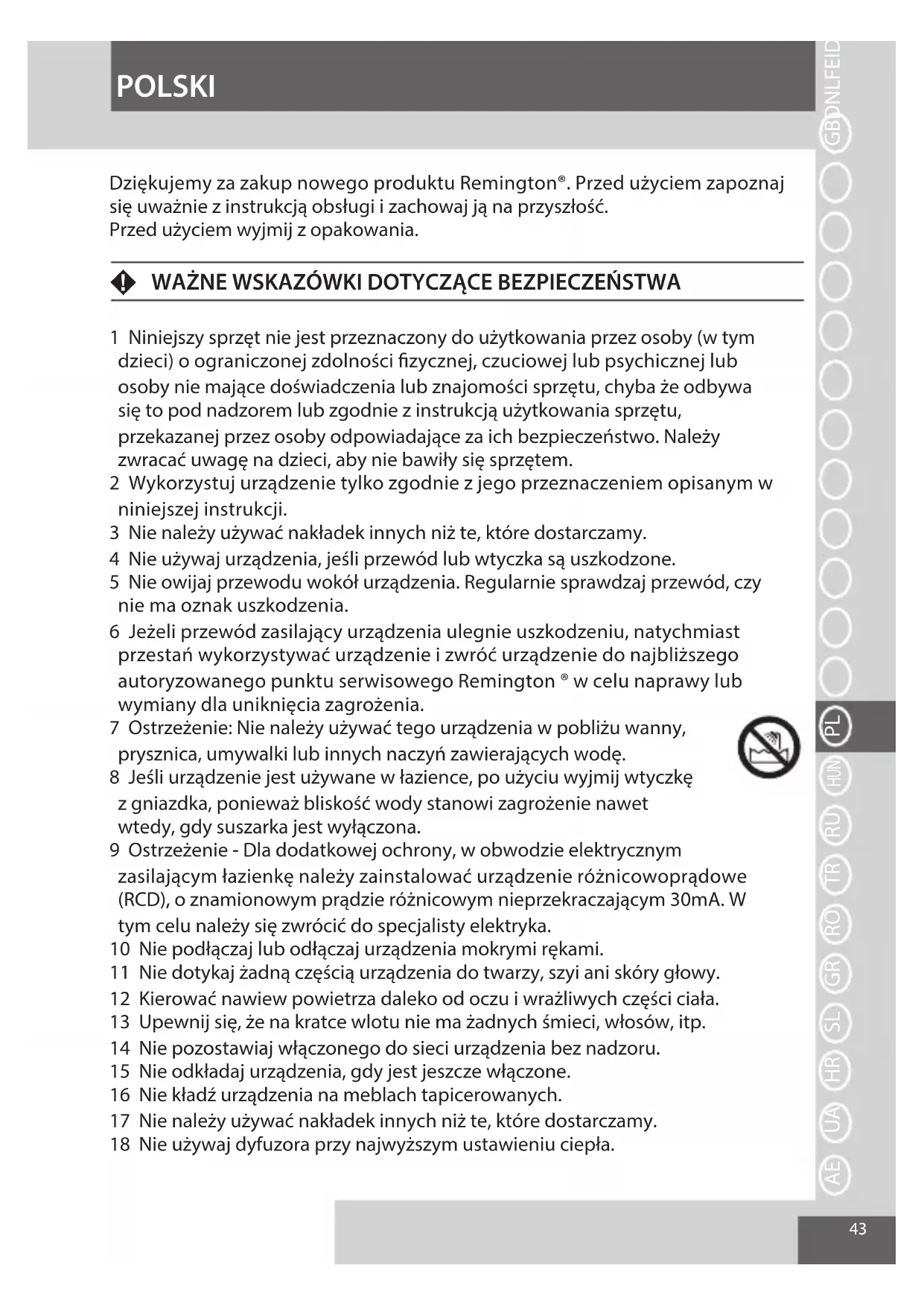 Dziekujemy za zakup nowego produktu Remington. Przed uzyciem zapoznaj sie uwaznie z instrukcja obstugi i zachowaj ja na przyszlość.