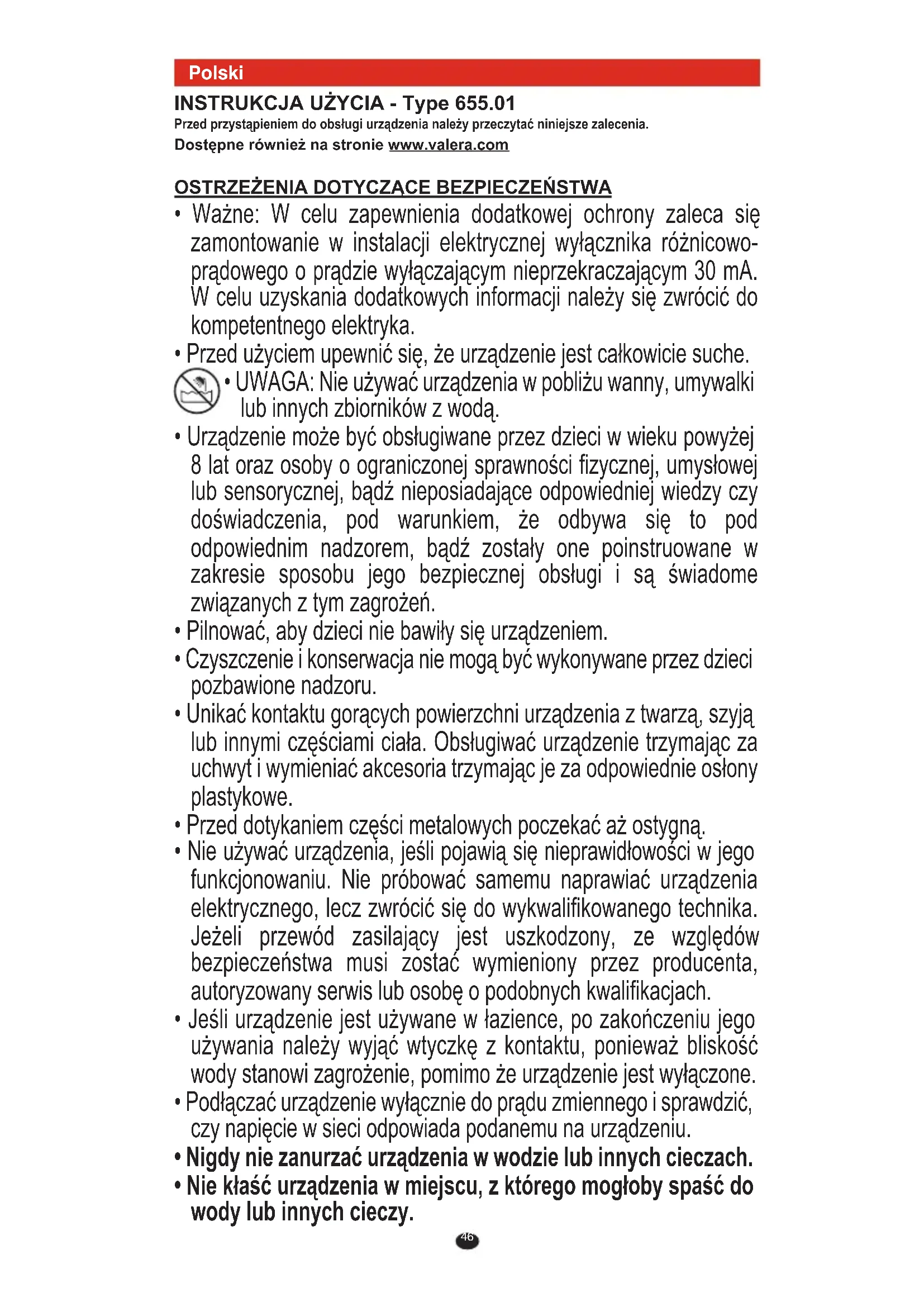 00060587 int_ott2014 02/10/2014 8.29 Pagina 4546 Polski INSTRUKCJA UŻYCIA - Type 655.01 Przed przystąpieniem do obsługi urządzenia należy przeczytać niniejsze zalecenia. Dostępne również na stronie www.valera.com