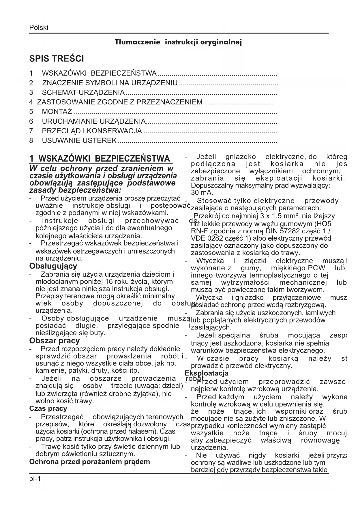 W celu ochrony przed zranieniem w czasie użytkowania i obsługi urządzenia obowiązują zastępujące podstawowe zasady bezpieczeństwa: - Przedużyciemurządzeniaproszęprzeczytać uważnie instrukcjeobsługi i postępować zgodniezpodanymiwniejwskazówkami. - Instrukcje obsługi przechowywać do późniejszegoużyciaidodlaewentualnego kolejnegowłaścicielaurządzenia. - Przestrzegaćwskazówekbezpieczeństwai wskazówekostrzegawczychiumieszczonych naurządzeniu. Obsługujący - Zabraniasięużyciaurządzeniadzieciomi młodocianymponiżej16rokużycia,którym niejestznananiniejszainstrukcjaobsługi. Przepisyterenowemogąokreślićminimalny wiek osoby dopuszczonej do obsługi urządzenia. - Osobyobsługujące urządzenie muszą posiadać długie, przylegającespodnie i nieślizgającesiębuty. Obszar pracy - Przedrozpoczęciempracynależydokładnie sprawdzićobszar prowadzenia robóti usunąćzniegowszystkieciałaobce,jaknp. kamienie,patyki,druty,kościitp. - Jeżeli na obszarze prowadzenia robót znajdująsię osoby trzecie(uwaga:dzieci) lubzwierzęta(równieżdrobneżyjątka),nie wolnokosićtrawy. Czas pracy - Przestrzegać obowiązującychterenowych przepisów, które określajądozwolony czas użyciakosiarki(ochronaprzedhałasem).Czas pracy,patrzinstrukcjaużytkownikaiobsługi. - Trawękosićtylkoprzyświetledziennymlub dobrymoświetleniusztucznym. Ochrona przed porażaniem prądem - Jeżeli gniazdko elektryczne,do którego podłączona jest kosiarka nie jest zabezpieczone wyłącznikiem ochronnym, zabrania się eksploatacji kosiarki. Dopuszczalnymaksymalnyprądwyzwalający: 30mA. - Stosowaćtylkoelektryczne przewody zasilająceonastępującychparametrach: Przekrójconajmniej3x1,5mm²,nielżejszy niżlekkieprzewodywwężugumowym(HO5 RN-FzgodnieznormąDIN57282część1/ VDE0282część1)alboelektrycznyprzewód zasilającyoznaczonyjakodopuszczonydo zastosowaniazkosiarkądotrawy. - Wtyczka i złączki elektryczne musząbyć wykonanez gumy, miękkiegoPCW lub innego tworzywa termoplastycznego o tej samej wytrzymałości mechanicznej lub musząbyćpowleczonetakimtworzywem. - Wtyczka igniazdko przyłączeniowe muszą posiadaćochronęprzedwodąrozbryzgową. - Zabraniasięużyciauszkodzonych,łamliwych lubpoplątanychelektrycznychprzewodów zasilających. - Jeżelispecjalna śruba mocująca zespół tnącyjestuszkodzona,kosiarkaniespełnia warunkówbezpieczeństwaelektrycznego. - Wczasie pracy kosiarką należy stale prowadzićprzewódelektryczny. Eksploatacja - Przedużyciem przeprowadzić zawsze najpierwkontrolęwzrokowąurządzenia. - Przedkażdym użyciem należy wykonać kontrolęwzrokowąwceluupewnieniasię, że noże tnące,ich wspornikioraz śruby mocująceniesązużytelubzniszczone.W przypadkukoniecznościwymianyzastąpić wszystkie noże tnące i śruby mocujące abyzabezpieczyć właściwą równowagę urządzenia. - Nie używać nigdy kosiarki jeżeliprzyrządy ochronysąwadliwelubuszkodzonelubtym bardziejgdyprzyrządybezpieczeństwatakie pl-1 Polski Tłumaczenie instrukcji oryginalnejPolski jakdeektorczyzbiornikściętejtrawyniesą nawłaściwymmiejscu - Zatrzymaćsilnikiodłączyćnasadkęświecy zapłonowej: -Przedusunięciemewentualnychprzeszkód iczyszczeniemkanałuwyrzutowego - Po uderzeniu w inny przedmiot - Jeżeli urządzenie zaczyna wibrować w nieprawidłowysposób - Pozostawićwszystkienakrętki,śruby,zakrętki dobrze zaciśnięte aby zagwarantować bezpiecznefunkcjonowanieurządzenia - Kontrolować często czy zbiornik ściętej trawyniewykazujeśladówzużycialub uszkodzenia Uszkodzonelubzużyteczęścinależy natychmiastwymienić. - Urządzenieeksploatowaćtylkowstanietechnicznym przepisanym przez jego producenta. - Użytkownikurządzeniajestodpowiedzialny zawypadkizudziałemosóbtrzecichlub obcego mienia. - Wyłączyć silnik na czas przeprowadzania urządzenia przez inne powierzchnie, niż powierzchnia koszona. - Niewłączaćsilnika,jeżeliosobaobsługująca(lub osobytrzecie)stoiprzedkanałemwylotowym (kosiarkazbocznymkanałemwylotowym). - Kosiarkę do trawy używać tylko na trawnikach. - Niewolnowyłączaćdziałaniawyposażenia bezpieczeństwaanielementówochronnych kosiarki. - Kosiarkę można włączać tylko wtedy, jeżeli zespół tnący swobodnie się obraca. Ewentualnenapędywysprzęglić. - Jeżeli zachodzi konieczność podniesienia kosiarkidostartu,zespółtnącymusi wskazywać w kierunku osoby obsługującej. - Dłonieistopytrzymaćzdalaodwirujących częściurządzenia. - Użytkowaniekosiarkidozwolonejest tylko zzachowaniemodstępu bezpieczeństwa, którywyznaczauchwytprowadzący. - Zwracaćuwagęnastabilnąpodstawę. - Niewolnopodnosić,aniprzenosićkosiarki zpracującymsilnikiem.Odczekać, aż zespółtnącyzatrzymasięiwyjąćwtyczkęz gniazdka sieciowego. - Kosićzawszewpoprzekzbocza.Nieprowadzić kosiarkipodgórę,anizgóry,niekosićzboczy onachyleniuwiększymniż15°. - Zachowywać ostrożność przy zmianie kierunkuiprzykoszeniuwruchudotyłu. - Kosiarkęprowadzićtylkowtempiekroków. Niepozostawiaćkosiarkibeznadzoru. - Zatrzymaćurządzenieiwyciągnąćwtyczkę z gniazdka sieciowego po uderzeniu obcym przedmiotem. - Zatrzymaćurządzenieiwyciągnąćwtyczkęz gniazdka sieciowego, gdy kosiarka zaczyna nienormalniedrgać(natychmiastsprawdzić). Przegląd, konserwacja i przechowywanie. Przedprzystąpieniemdowszelkich prac przy urządzeniu: - Wyłączyćsilnik,odczekać,ażzespółtnący całkowiciesięzatrzyma iwyjąćwtyczkęz gniazdka sieciowego. - Do prac przy zespole tnącym założyć rękawiceochronne. - Niepryskaćkosiarkiwodą. - Wszelkienaprawy urządzenia można przeprowadzić tylko w autoryzowanym punkcie serwisowym. - Sprawdzać często stan zużycia lub uszkodzeniapojemnikanatrawę. Części zamienne i wyposażenie - Stosowaćtylkooryginalneczęścizamienne ioryginalnewyposażenie. - Zastrzegasięprawowprowadzaniazmian konstrukcyjnychiwersjiurządzenia. Wyposażenie bezpieczeństwa Dźwignia włączająca Wmomenciewystąpienian