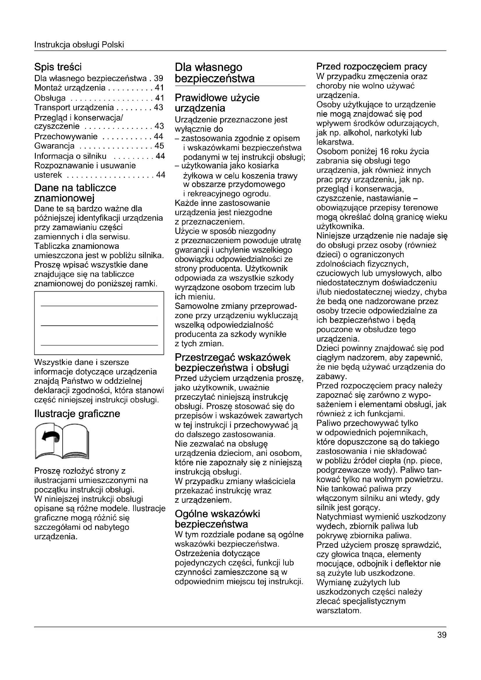 - Rozpoznawanie i usuwanie usterek Dane na tabliczce znamionowej Dane te są bardzo ważne dla późniejszej identyfikacji urządzenia przy zamawianiu części zamiennych i dla serwisu. Tabliczka znamionowa umieszczona jest w pobliżu silnika. Proszę wpisać wszystkie dane znajdujące się na tabliczce znamionowej do poniższej ramki. Wszystkie dane i szersze informacje dotyczące urządzenia znajdą Państwo w oddzielnej deklaracji zgodności, która stanowi część niniejszej instrukcji obsługi. Ilustracje graficzne Proszę rozłożyć strony z ilustracjami umieszczonymi na początku instrukcji obsługi. W niniejszej instrukcji obsługi opisane są różne modele. Ilustracje graficzne mogą różnić się szczegółami od nabytego urządzenia. Dla własnego bezpieczeństwa Prawidłowe użycie urządzenia Urządzenie przeznaczone jest wyłącznie do – zastosowania zgodnie z opisem i wskazówkami bezpieczeństwa podanymi w tej instrukcji obsługi; – użytkowania jako kosiarka żyłkowa w celu koszenia trawy w obszarze przydomowego i rekreacyjnego ogrodu. Każde inne zastosowanie urządzenia jest niezgodne z przeznaczeniem. Użycie w sposób niezgodny z przeznaczeniem powoduje utratę gwarancji i uchylenie wszelkiego obowiązku odpowiedzialności ze strony producenta. Użytkownik odpowiada za wszystkie szkody wyrządzone osobom trzecim lub ich mieniu. Samowolne zmiany przeprowad- zone przy urządzeniu wykluczają wszelką odpowiedzialność producenta za szkody wynikłe z tych zmian. Przestrzegać wskazówek bezpieczeństwa i obsługi Przed użyciem urządzenia proszę, jako użytkownik, uważnie przeczytać niniejszą instrukcję obsługi. Proszę stosować się do przepisów i wskazówek zawartych w tej instrukcji i przechowywać ją do dalszego zastosowania. Nie zezwalać na obsługę urządzenia dzieciom, ani osobom, które nie zapoznały się z niniejszą instrukcją obsługi. W przypadku zmiany właściciela przekazać instrukcję wraz z urządzeniem. Ogólne wskazówki bezpieczeństwa W tym rozdziale podane są ogólne wskazówki bezpieczeństwa. Ostrzeżenia dotyczące pojedynczych części, funkcji lub czynności zamieszczone są w odpowiednim miejscu tej instrukcji. Przed rozpoczęciem pracy W przypadku zmęczenia oraz choroby nie wolno używać urządzenia. Osoby użytkujące to urządzenie nie mogą znajdować się pod wpływem środków odurzających, jak np. alkohol, narkotyki lub lekarstwa. Osobom poniżej 16 roku życia zabrania się obsługi tego urządzenia, jak również innych prac przy urządzeniu, jak np. przegląd i konserwacja, czyszczenie, nastawianie – obowiązujące przepisy terenowe mogą określać dolną granicę wieku użytkownika. Niniejsze urządzenie nie nadaje się do obsługi przez osoby (również dzieci) o ograniczonych zdolnościach fizycznych, czuciowych lub umysłowych, albo niedostatecznym doświadczeniu i/lub niedostatecznej wiedzy, chyba że bedą one nadzorowane przez osoby trzecie odpowiedzialne za ich bezpieczeństwo i będą pouczone w obsłudze tego urządzenia. Dzieci powinny znajdować się pod ciągłym nadzorem, aby zapewnić, że nie będą używać urządzenia do zabawy. Przed rozpoczęciem pracy należy zapoznać się zarówno z wypo- sażeniem i elementami obsługi, jak również z ich funkcjami. Paliwo przechowywać tylko w odpowiednich pojemnikach, które dopuszczone są do takiego zastosowania i nie składować w pobliżu źródeł ciepła (np. piece, podgrzewacze wody). Paliwo tan- kować tylko na wolnym powietrzu. Nie tankować paliwa przy włączonym silniku ani wtedy, gdy silnik jest gorący. Natychmiast wymienić uszkodzony wydech, zbiornik paliwa lub pokrywę zbiornika paliwa. Przed użyciem proszę sprawdzić, czy głowica tnąca, elementy mocujące, odbojnik i deflektor nie są zużyte lub uszkodzone. Wymianę zużytych lub uszkodzonych części należy zlecać specjalistycznym warsztatom.Polski Instrukcja obsługi Części zamienne i wyposażenie muszą spełniać warunki podane przez producenta urządzenia. Dlatego proszę stosować tylko oryginalne części zamienne i oryginalne wyposażenie, albo części zamienne i wyposażenie, które dopuszczone są przez producenta urządzenia do takiego zastosowania.Stosować tylko żyłki/urządzenia tnące dozwolone przez producenta. Wszelkie naprawy urządzenia proszę zlecić do wykonania tylko w autoryzowanym punkcie serwisowym. Podczas pracy urządzeniem Podczas pracy urządzeniem lub przy urządzeniu należy stosować odpowiednią odzież roboczą, jak np.:– bezpieczne obuwie robocze,– długie spodnie,– wąską, przylegającą odzież,– osobiste środki ochrony słuchu,– okulary ochronne.Wszystkie elementy wyposażenia bezpieczeństwa muszą być zawsze kompletnie zamontowane na urządzeniu i nie mogą być uszkodzone.Nie wolno dokonywać żadnych zmian w wyposażeniu bezpieczeństwa.Urządzenie używać tylko w takim stanie technicznym w jakim zostało dostarczone i wyznaczone przez producenta.Nigdy nie zmieniać wstępnych ustawień fabrycznych silnika.Unikać otwartego ognia, iskrzenia i nie palić. Przed pracą przy urządzeniu W celu ochrony przed zranieniem, przed przystąpieniem do jakichkolwiek prac przy urządzeniu (np. przegląd, konserwacja, nastawianie) i przed transportem urządzenia (np. podnoszenie lub przenoszenie) należy– wyłączyć silnik,– odczekać, aż wszystkie ruchome części całkowicie się zatrzymają, a silnik się ochłodzi,– wyjąć wtyczkę świec zapłonowych przy silniku, aby uniemożliwić przypadkowe włączenie silnika,– przestrzegać dodatkowych wskazówek bezpieczeństwa podanych w instrukcji obsługi silnika. Po zakończeniu pracy urządzeniem Proszę nigdy nie pozostawiać urządzenia bez uprzedniego wyłączenia silnika. Wyposażenie zabezpieczające Rysunek 1 Niebezpieczeństwo Nie wolno nigdy używać urządzenia, jeżeli wyposażenie bezpieczeństwa jest uszkodzone lub nie jest zamontowane. Uchwyt bez
