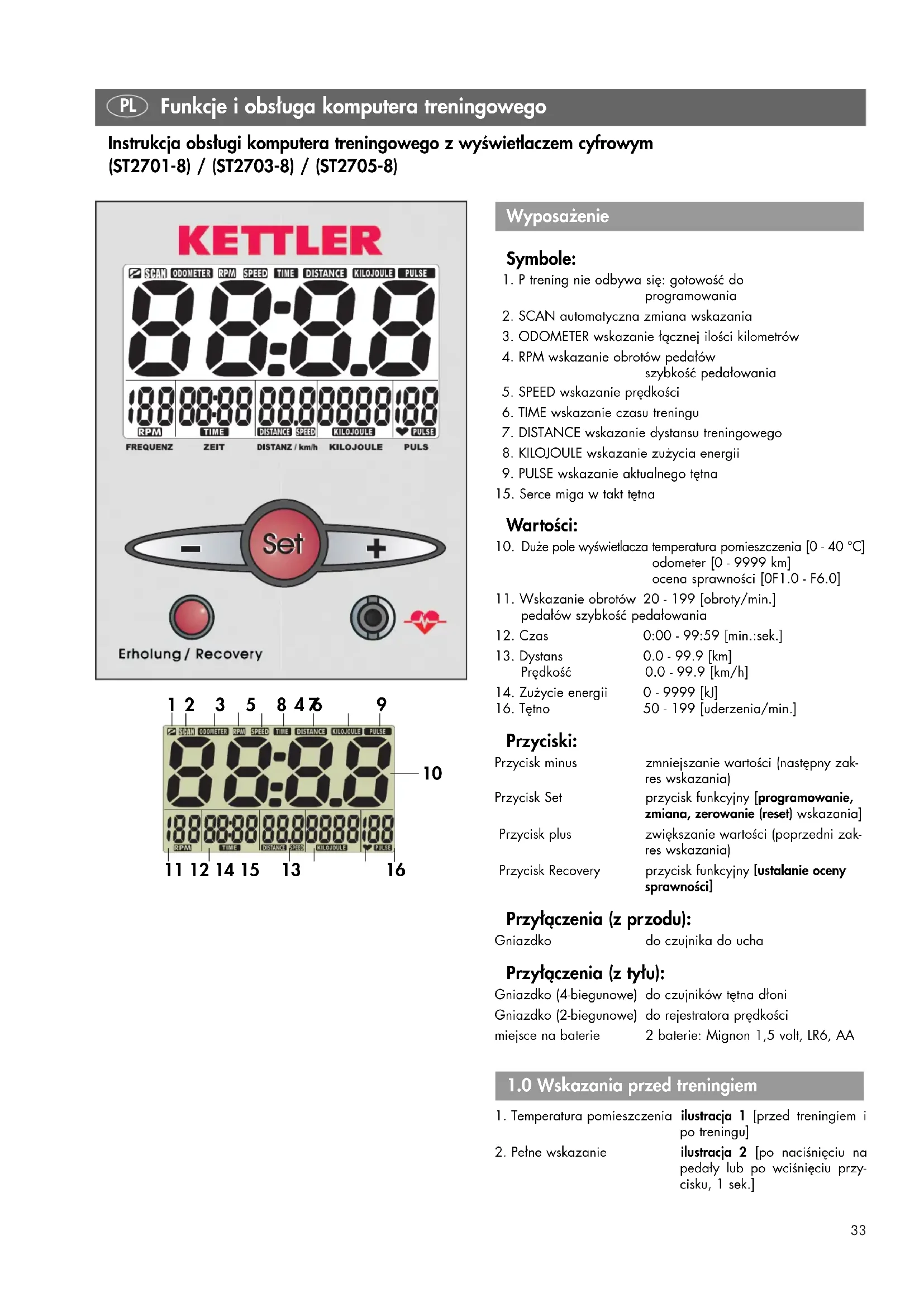 Przyciski: Przycisk minus zmniejszanie wartości (następny zak- res wskazania) Przycisk Set przycisk funkcyjny [programowanie, zmiana, zerowanie (reset) wskazania] Przycisk plus zwiększanie wartości (poprzedni zak- res wskazania) Przycisk Recovery przycisk funkcyjny [ustalanie oceny sprawności] Przyłączenia (z przodu): Gniazdko do czujnika do ucha Przyłączenia (z tyłu): Gniazdko (4-biegunowe) do czujników tętna dłoni Gniazdko (2-biegunowe) do rejestratora prędkości miejsce na baterie 2 baterie: Mignon 1,5 volt, LR6, AA