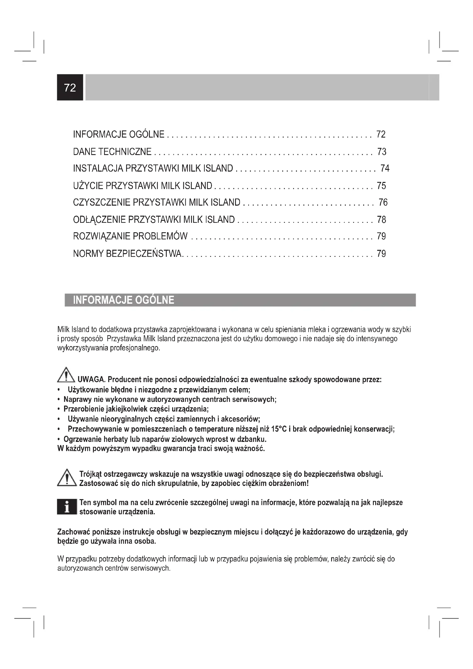 Milk Island to dodatkowa przystawka zaprojektowana i wykonana w celu spieniania mleka i ogrzewania wody w szybki i prosty sposób Przystawka Milk Island przeznaczona jest do użytku domowego i nie nadaje się do intensywnego wykorzystywania profesjonalnego. UWAGA. Producent nie ponosi odpowiedzialności za ewentualne szkody spowodowane przez: