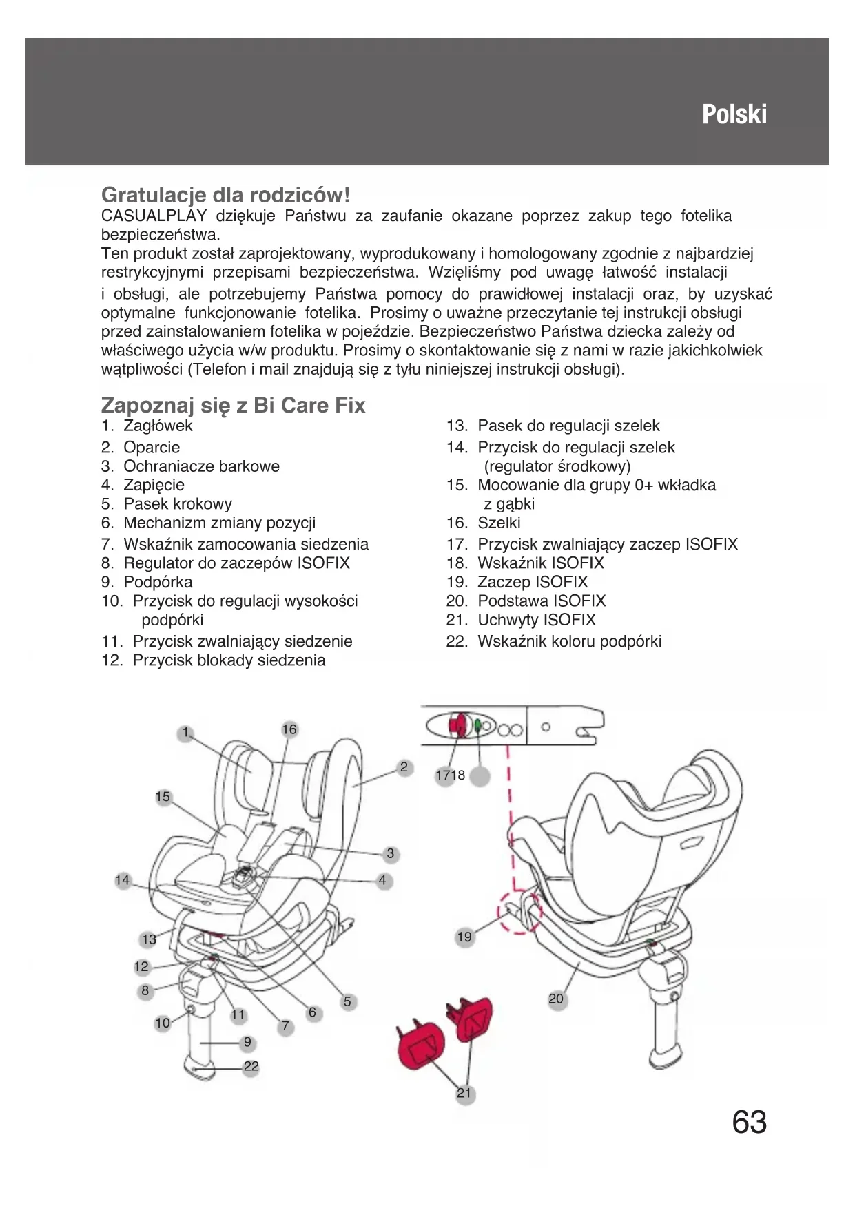 Gratulacje dla rodziców! CASUALPLAY dziękuje Państwu za zaufanie okazane poprzez zakup tego fotelika bezpieczeństwa. Ten produkt został zaprojektowany, wyprodukowany i homologowany zgodnie z najbardziej restrykcyjnymi przepisami bezpieczeństwa. Wzięliśmy pod uwagę łatwość instalacji i obsługi, ale potrzebujemy Państwa pomocy do prawidłowej instalacji oraz, by uzyskać optymalne funkcjonowanie fotelika. Prosimy o uważne przeczytanie tej instrukcji obsługi przed zainstalowaniem fotelika w pojeździe. Bezpieczeństwo Państwa dziecka zależy od właściwego użycia w/w produktu. Prosimy o skontaktowanie się z nami w razie jakichkolwiek wątpliwości (Telefon i mail znajdują się z tyłu niniejszej instrukcji obsługi). Polski64 Ostrzeżenia i uwagi dotyczące bezpieczeństwa NINIEJSZA INSTRUKCJA OBSŁUGI POWINNA BYĆ PRZECHOWYWANA RAZEM Z FOTELIKIEM Bi Care Fix PODCZAS UŻYWANIA. NALEŻY UWAŻNIE PRZECZYTAĆ TĘ INSTRUKCJĘ OBSŁUGI PRZED UŻYCIEM ARTYKUŁU I ZACHOWAĆ JĄ NA PRZYSZŁOŚĆ. W PRZYPADKU NIEPRZESTRZEGANIA TEJ INSTRUKCJI OBSŁUGI BEZPIECZEŃSTWO DZIECKA MOŻE BYĆ ZAGROŻONE.