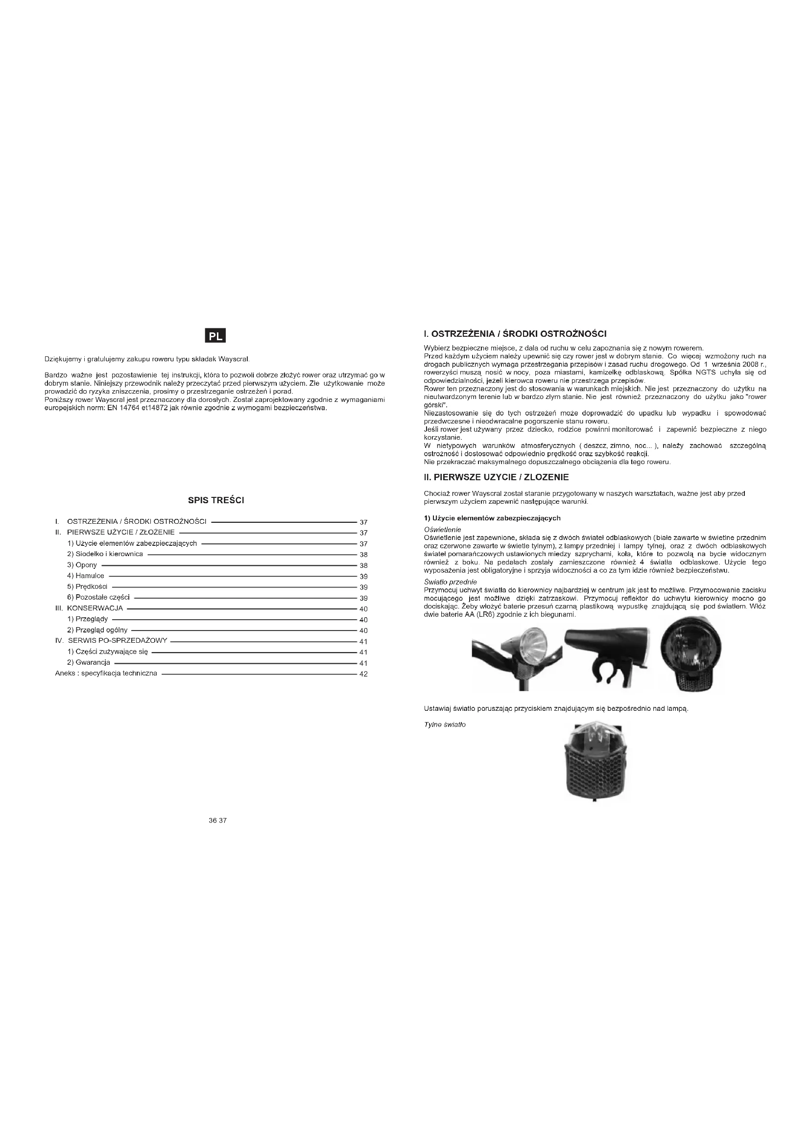 Aneks : specyfikacja techniczna Dziękujemy i gratulujemy zakupu roweru typu składak Wayscral. Bardzo ważne jest pozostawienie tej instrukcji, która to pozwoli dobrze złożyć rower oraz utrzymać go w dobrym stanie. Niniejszy przewodnik należy przeczytać przed pierwszym użyciem. Złe użytkowanie może prowadzić do ryzyka zniszczenia, prosimy o przestrzeganie ostrzeżeń i porad. Poniższy rower Wayscral jest przeznaczony dla dorosłych. Został zaprojektowany zgodnie z wymaganiami europejskich norm: EN 14764 et14872 jak równie zgodnie z wymogami bezpieczeństwa.