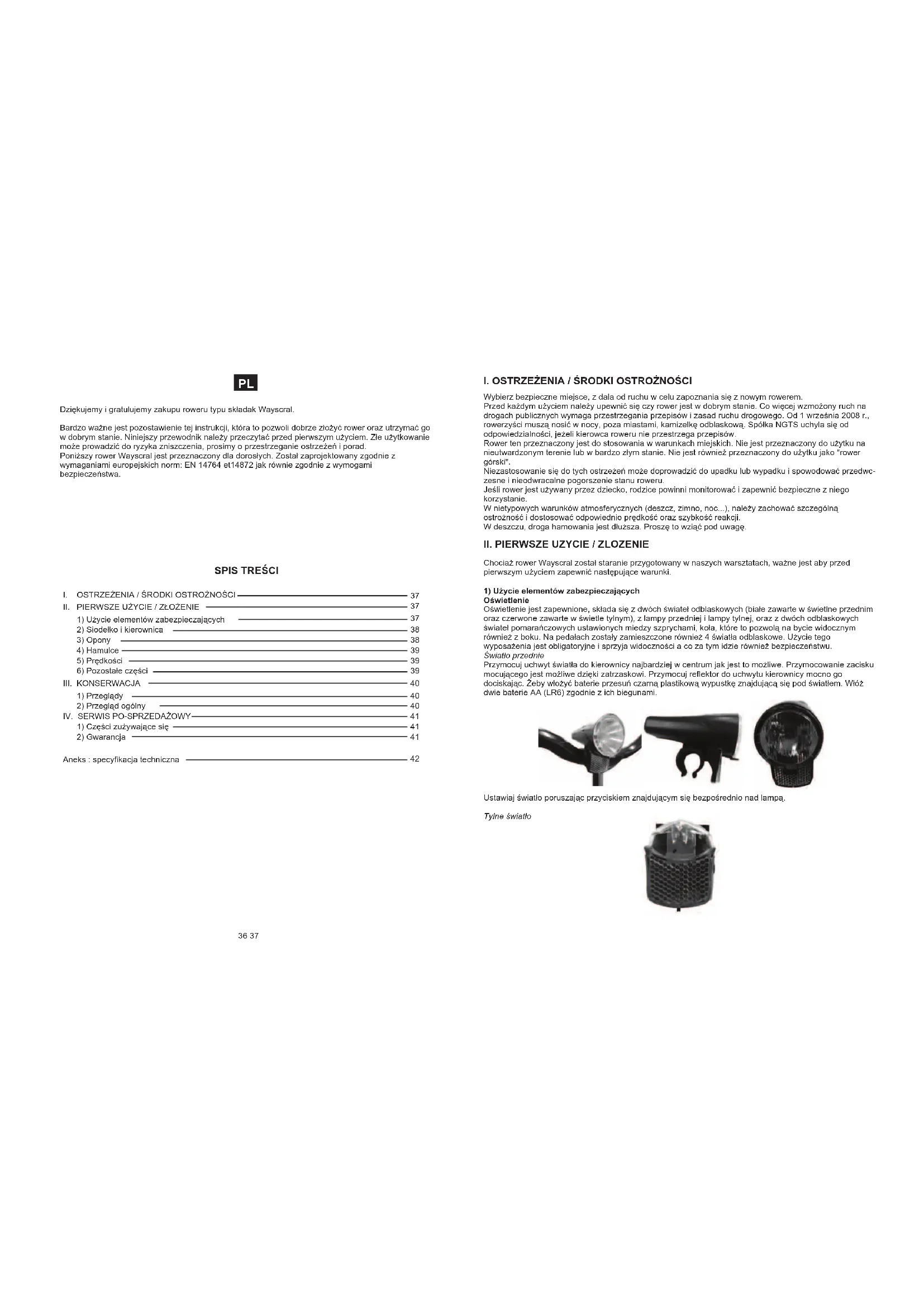 Aneks : specyfikacja techniczna Dziękujemy i gratulujemy zakupu roweru typu składak Wayscral. Bardzo ważne jest pozostawienie tej instrukcji, która to pozwoli dobrze złożyć rower oraz utrzymać go w dobrym stanie. Niniejszy przewodnik należy przeczytać przed pierwszym użyciem. Złe użytkowanie może prowadzić do ryzyka zniszczenia, prosimy o przestrzeganie ostrzeżeń i porad. Poniższy rower Wayscral jest przeznaczony dla dorosłych. Został zaprojektowany zgodnie z wymaganiami europejskich norm: EN 14764 et14872 jak równie zgodnie z wymogami bezpieczeństwa.