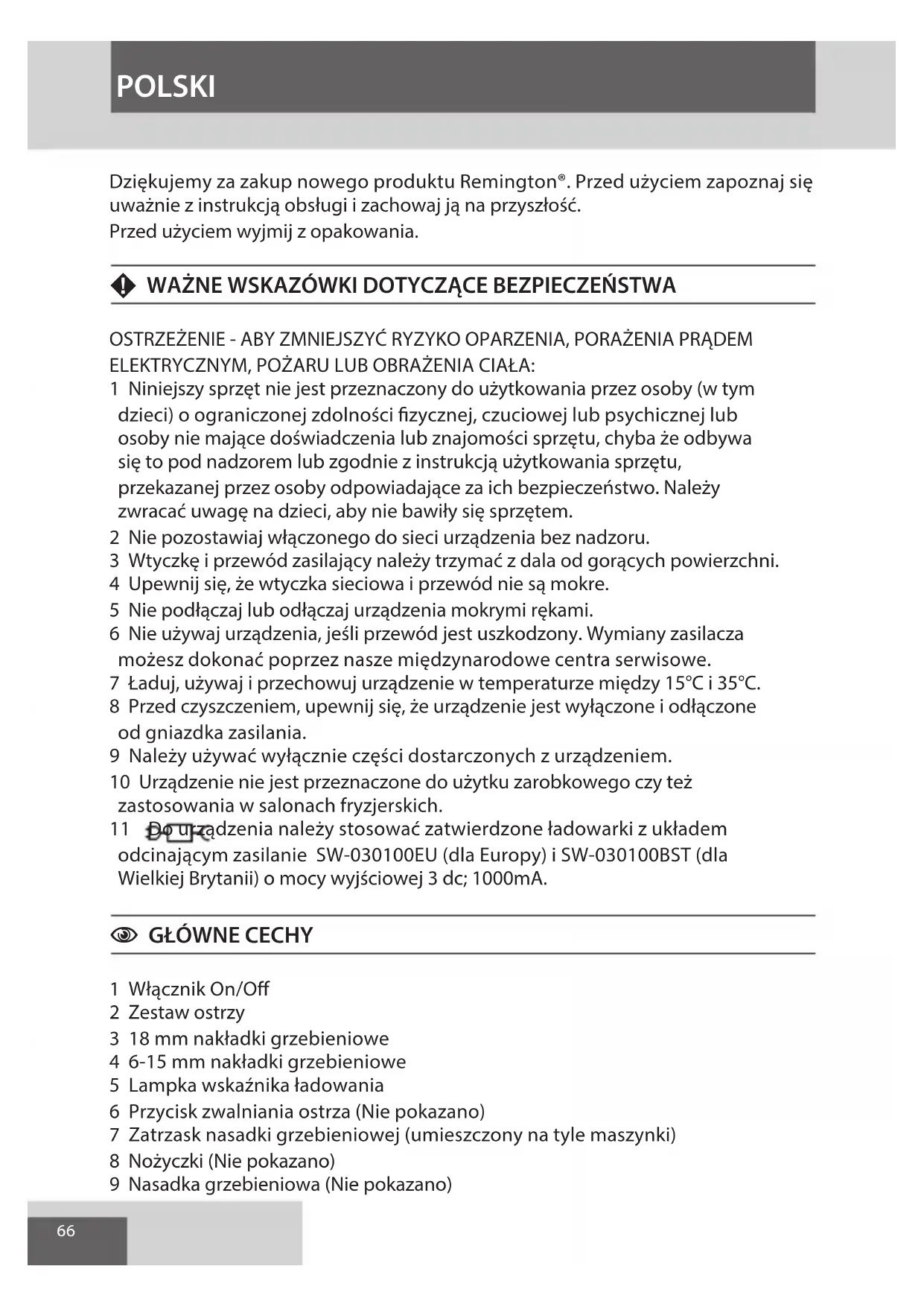 Dziekujemy za zakup nowego produktu Remington. Przed uzyciem zapoznaj sie uwazmie z instrukcja obstugi i zachowaj ja na przyszlość.