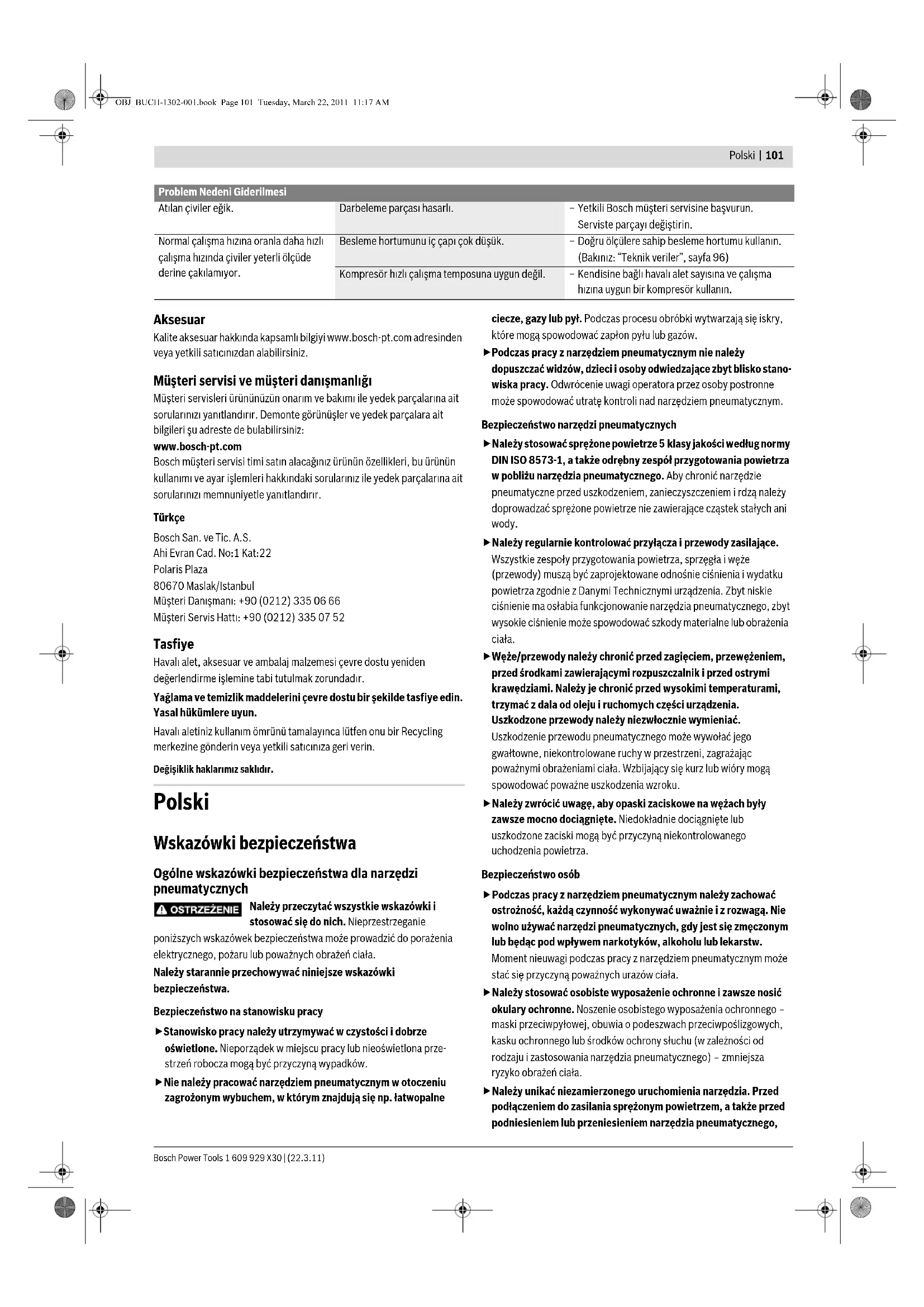 Ciężar odpowiednio do EPTA-Procedure 01/2003 kg 1,86 OBJ_BUCH-1302-001.book Page 103 Tuesday, March 22, 2011 11:17 AM1 609 929 X30 | (22.3.11) Bosch Power Tools 104 | Polski Deklaracja zgodności Oświadczamy z pełną odpowiedzialnością, że produkt, przedstawiony w rozdziale „Dane techniczne“, odpowiada wymaganiom następujących norm i dokumentów normatywnych: EN 792 – zgodnie z wymaganiami dyrektyw: 2006/42/WE. Dokumentacja techniczna: Robert Bosch GmbH, PT/ESC, D-70745 Leinfelden-Echterdingen Robert Bosch GmbH, Power Tools Division D-70745 Leinfelden-Echterdingen Leinfelden, 22.03.2011 Montaż Podłączenie zasilania powietrzem (zob. rys. A) Należy upewnić się, że ciśnienie instalacji sprężonego powietrza nie jest większe od maksymalnie dopuszczalnego ciśnienia nominalnego urządzenia pneumatycznego. W pierwszej kolejności ustawić ciśnienie powietrza na niższą wartość zalecanego ciśnienia nominalnego (zob. „Dane techniczne“). W razie wątpliwości należy za pomocą manometru skontrolować ciśnienie przy wylocie powietrza, po uprzednim wyłączeniu narzędzia pneumatycznego. Aby osiągnąć maksymalną wydajność urządzenia należy kierować się podanymi wartościami węża powietrza zasilającego 15 (gwint przyłączeniowy, maksymalne ciśnienie robocze, wewnętrzna węża, maksymalna długość węża; zob. „Dane techniczne“). Aby chronić urządzenie przed uszkodzeniem, zanieczyszczeniami i tworzeniem się rdzy należy doprowadzać sprężone powietrze nie zanie- czyszczone ciałami obcymi i wolne od wilgoci. Wszystkie przewody, złączki i węże muszą być odpowiednio przystosowane do ciśnienia i do wydatku powietrza. Należy unikać zwężenia przewodów zasilających, np. przez zgniecenie, załamanie lub rozciąganie! Podłączenie zasilania powietrzem do narzędzia pneumatycznego – Opróżnić magazynek 10. (zob. „Opróżnianie magazynka“, str. 105) Podczas następnych etapów pracy może dojść do wyrzutu elementu mocującego (wbijanego), w przypadku, gdy – z przyczyn takich jak czynności konserwacyjne lub naprawcze, jak również transport – wewnętrzne elementy urządzenia pneumatycznego nie znajdują się w pozycji wyjściowej. – Połączyć złączkę 8 z wężem 15, zaopatrzonym w szybkozłączkę 14. – Skontrolować, czy urządzenie pneumatyczne funkcjonuje bez zarzutu przez przyłożenie wylotu 13 lub ewentualnie gumowego zderzaka chroniącego powierzchnię materiału 1 do kawałka drzewa lub innego drewnianego materiału i oddać jeden do dwóch strzałów. Napełnianie magazynku (zob. rys. B1–B4) Przed regulacją urządzenia, wymianą osprzętu lub zaprzestając pracy narzędziem, należy odłączyć zasilanie powietrzem. Ten środek ostrożności zapobiega niezamierzonemu włączeniu się narzędzia pneumatycznego. fStosować należy tylko oryginalny osprzęt firmy Bosch (zob. „Dane techniczne“). Drobne elementy urządzenia pneumatycznego, takie jak magazynek, wylot, prowadnica przystosowane zostały do klamer, gwoździ i sztyftów wyprodukowanych przez firmę Bosch. Elementy mocujące innych producentów mają inne wymiary i wyprodukowane zostały z innego rodzaju stali. Zastosowanie niedozwolonych elementów mocujących może spowodować uszkodzenie urządzenia pneumatycznego oraz spowodować obrażenia. Podczas ładowania magazynku, urządzenie pneumatyczne należy trzymać w taki sposób, aby nie kierować wylotu 13 ani na siebie, ani na inne osoby. – Oczyścić i nasmarować sanie magazynka 11 i sprawdzić, czy magazynek 10 jest wolny od zanieczyszczeń. – Wsunąć odpowiedni pas gwoździ 16 do otworu w kształcie litery T, znajdującego się na końcu magazynka 10. Czubki gwoździ należy przy tym wprowadzić jako pierwsze. – Pas gwoździ przesunąć w magazynku do przodu, tak aby ostatni gwóźdź znajdował się przed sprężyną magazynka 17. Wskazówka: Blokada sani magazynka ma na celu zapobieżenie uruchomieniu urządzenia pneumatycznego z pustym magazynkiem. Zabezpieczenie wyzwalacza nie daje się wcisnąć, co zapobiega „pustym“ strzałom. – Docisnąć naprężony zabierak gwoździ 18 do sani 11, pociągając równocześnie sanie magazynka aż do samego końca magazynka 10. Wskazówka: Sanie magazynka powinny dać się lekko przesunąć do pozycji wyjściowej (siłą palców). Jeżeli sanie magazynka stawiają opór, oznacza to, że gwoździe wstrzeliwane będą pod niewłaściwym kątem. – Przesunąć sanie 11 (z wciśniętym zabierakiem gwoździ 18) ostrożnie do przodu, tak aby zabierak przesunął się ponad ostatnim gwoździem, przesuwając w ten sposób pas gwoździ w magazynku do przodu. Wskazówka: Nie wolno dopuszczać do tego, by sanie magazynka zaskoczyły z powrotem samoczynnie (bez prowadzenia). Może spowodować to uszkodzenie sani, a także istnieje niebezpieczeństwo przycięcia palców. Praca Systemy (tryby) działania Urządzenie pneumatyczne działa w dwóch trybach wyzwalania: – Działanie (strzały) pojedyncze w serii Aby pracować w tym trybie należy najpierw mocno przyłożyć zabezpieczenie wyzwalacza 2 do obrabianego materiału. Element wbijany zostanie wystrzelony dopiero po wciśnięciu wyzwalacza 5. Następne wbijanie jest możliwe dopiero po ustawieniu wyzwalacza i zabezpieczenia wyzwalacza w pozycji wyjściowej. – Działanie (strzały) kontaktowe W tym trybie pracy konieczne jest uprzednie wciśnięcie wyzwalacza 5. Element wbijany zostanie wystrzelony dopiero wtedy, gdy przy wciśniętym wyzwalaczu zabezpieczenie wyzwalacza 2 zostanie silnie przyłożone do materiału. Dzięki temu osiągnięta zostanie wyższa prędkość pracy. Aby ustawić tryb wyzwalania, należy posłużyć się przełącznikiem 6. Dr. Egbert Schneider Senior Vice President Engineering Dr. Eckerhard Strötgen Head of Product Certification OBJ_BUCH-1302-001.book Page 104 Tuesday, March 22, 2011 11:17 AMPolski | 105 Bosch Power Tools 1 609 929 X30 | (22.3.11) Uruchomie