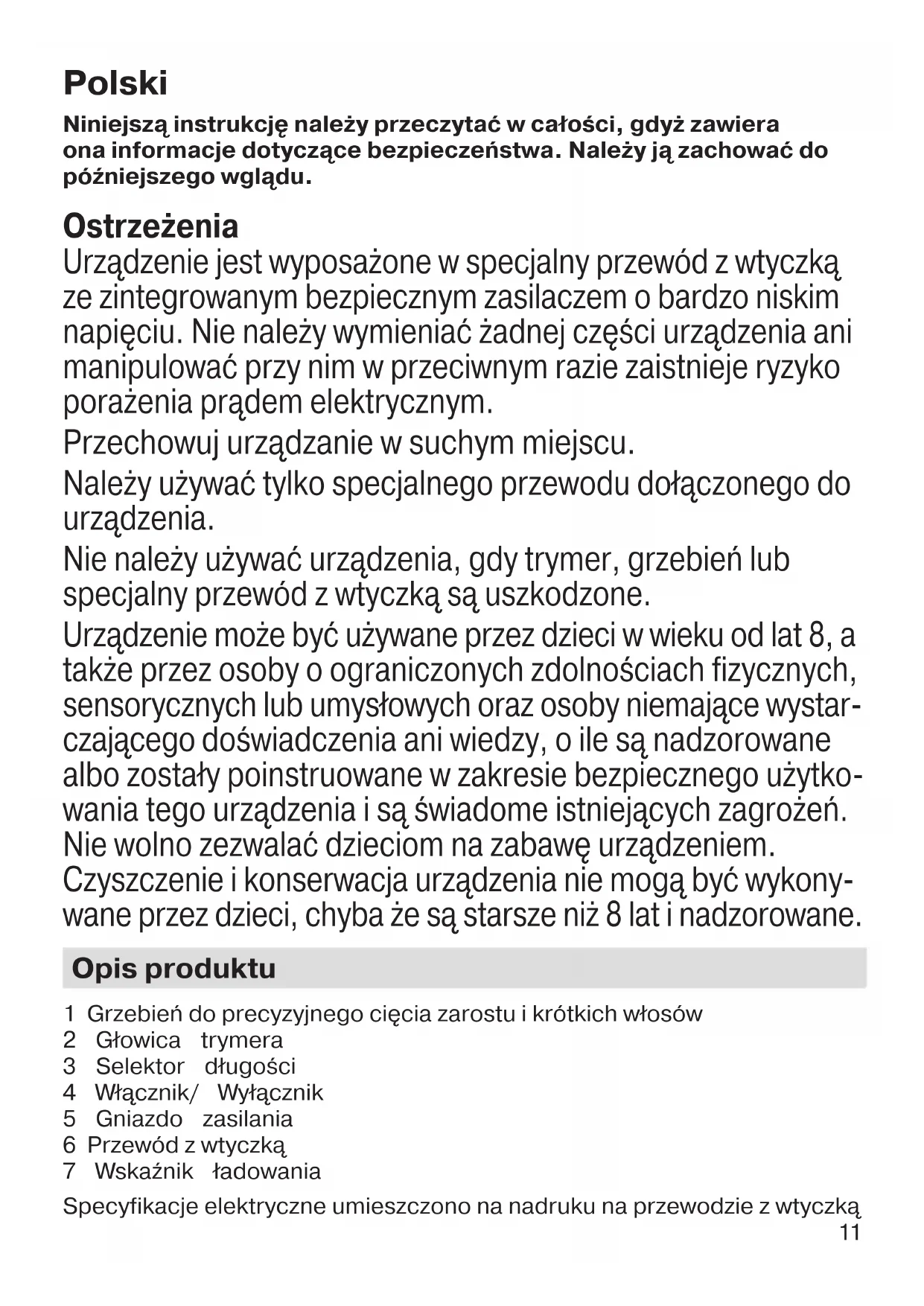 - Pour préserver le bon fonctionnement de la tondeuse, appliquez régulièrement quelques gouttes d’huile de machine légère (non fournie). Note environnementale Ce produit contient des piles et/ou des déchets électriques recyclables. Pour la protection de l’environnement, ne pas jeter avec les ordures ménagères, mais les porter dans les points de recyclage de déchets électriques disponibles dans votre pays. Sujet à des modifications sans préavis. Garantie Nous accordons une garantie de 2 ans sur ce produit, à partir de la date d’achat. Pendant la durée de la garantie, Braun prendra gratuitement à sa charge la réparation des vices de fabrication ou de matière en se réservant le droit de décider si certaines pièces doivent être réparées ou si l’appareil lui-même doit être échangé. Cette garantie s’étend à tous les pays où cet appareil est commercialisé par Braun ou son distributeur exclusif. Cette garantie ne couvre pas : les dommages occasionnés par une utilisation inadéquate, l’usure normale (par exemple, grille et bloc-couteaux) ainsi que les défauts d’usures qui ont un effet négligeable sur la valeur ou l’utilisation de l’appareil. Cette garantie devient caduque si des réparations ont été effectuées par des personnes non agréées par Braun et si des pièces de rechange ne provenant pas de Braun ont été utilisées. Pour toute réclamation intervenant pendant la période de garantie, retournez ou rapportez l’appareil ainsi que l’attestation de garantie à votre revendeur ou à un Centre Service Agréé Braun. Veuillez vous référer à www.service.braun.com ou appeler le 0 800 944 802 (service consommateurs – service & appel gratuits) pour connaître le Centre Service Agrée Braun le plus proche de chez vous. Clause spéciale pour la France Outre la garantie contractuelle exposée ci-dessus, nos clients bénéficient de la garantie légale des vices caches prévue aux articles 1641 et suivants du Code civil. 91320161_BT_3020_CEEMEA.indd 1091320161_BT_3020_CEEMEA.indd 10 04.01.17 14:0804.01.17 14:08 CSS APPROVED Effective Date 12Jan2017 GMT - Printed 05Apr2017 Page 10 of 6011 Polski Niniejszą instrukcję należy przeczytać w całości, gdyż zawiera ona informacje dotyczące bezpieczeństwa. Należy ją zachować do późniejszego wglądu. Ostrzeżenia Urządzenie jest wyposażone w specjalny przewód z wtyczką ze zintegrowanym bezpiecznym zasilaczem o bardzo niskim napięciu. Nie należy wymieniać żadnej części urządzenia ani manipulować przy nim w przeciwnym razie zaistnieje ryzyko porażenia prądem elektrycznym. Przechowuj urządzanie w suchym miejscu. Należy używać tylko specjalnego przewodu dołączonego do urządzenia. Nie należy używać urządzenia, gdy trymer, grzebień lub specjalny przewód z wtyczką są uszkodzone. Urządzenie może być używane przez dzieci w wieku od lat 8, a także przez osoby o ograniczonych zdolnościach fizycznych, sensorycznych lub umysłowych oraz osoby niemające wystar- czającego doświadczenia ani wiedzy, o ile są nadzorowane albo zostały poinstruowane w zakresie bezpiecznego użytko- wania tego urządzenia i są świadome istniejących zagrożeń. Nie wolno zezwalać dzieciom na zabawę urządzeniem. Czyszczenie i konserwacja urządzenia nie mogą być wykony- wane przez dzieci, chyba że są starsze niż 8 lat i nadzorowane. Opis produktu 1 Grzebień do precyzyjnego cięcia zarostu i krótkich włosów 2 Głowica trymera 3 Selektor długości 4 Włącznik/ Wyłącznik 5 Gniazdo zasilania 6 Przewód z wtyczką 7 Wskaźnik ładowania Specyfikacje elektryczne umieszczono na nadruku na przewodzie z wtyczką 91320161_BT_3020_CEEMEA.indd 1191320161_BT_3020_CEEMEA.indd 11 04.01.17 14:0804.01.17 14:08 CSS APPROVED Effective Date 12Jan2017 GMT - Printed 05Apr2017 Page 11 of 6012 Ładowanie Zalecana temperatura otoczenia podczas ładowania wynosi od 5 °C do 35 °C. Akumulator może nie naładować się prawidłowo w ekstremalnie niskiej lub wysokiej temperaturze. Zalecana temperatura otoczenia podczas używania trymera wynosi od 15°C do 35°C. Nie należy wystawiać urządzenia na tem- peratury wyższe niż 50°C na dłuższy czas.