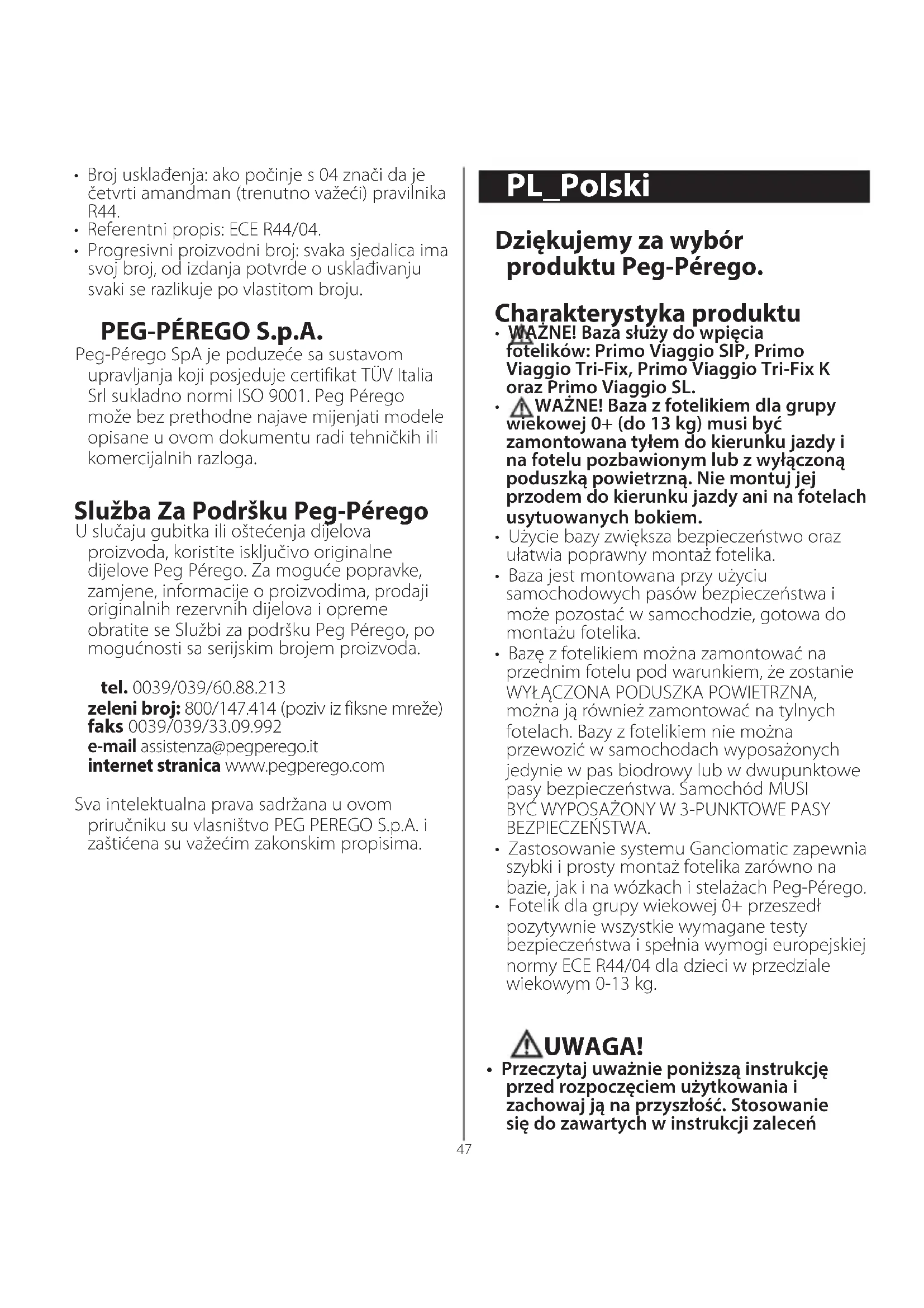 - Numer seryjny: poza homologacją każdy produkt posiada także własny numer seryjny. PEG-PÉREGO S.p.A. Peg-Pérego SpA to firma z wdrożonym systemem zarządzania jakością certyfikowanym przez TÜV Italia Srl, zgodnie z normą ISO 9001. Producent Peg-Pérego zastrzega sobie prawo do wprowadzania zmian w modelach prezentowanych w niniejszej publikacji dla celów technicznych i reklamowych. Serwis gwarancyjny i pogwarancyjny Peg-Pérego Jeżeli jakakolwiek z części zgubi się lub ulegnie zniszczeniu, nie używaj zamienników. W celu zdobycia informacji, wymiany lub naprawy produktu bądź zakupienia oryginalnych części możesz skontaktować się z producentem lub dystrybutorem w swoim kraju.. tel. 0039/039/60.88.213 e-mail assistenza@pegperego.it sito internet www.pegperego.com Wszelkie prawa autorskie dotyczące treści niniejszej instrukcji są własnością firmy Peg- Pérego S.p.A. i są chronione obowiązującym prawem.50 UA_Українська Дякуємо Вам за те, що Ви обрали продукцію Peg-Perego. Характеристики виробу