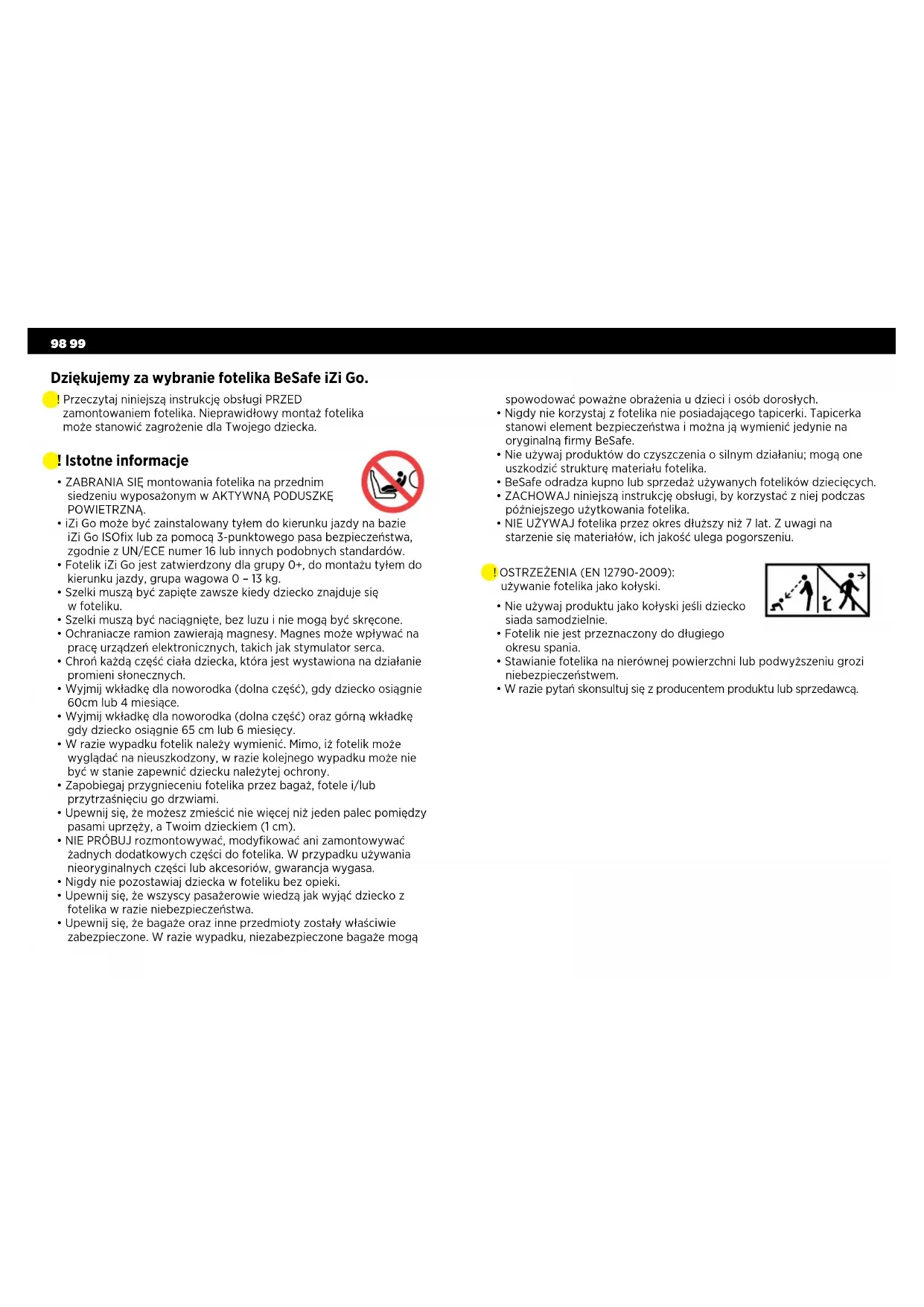 - Upewnij się, że bagaże oraz inne przedmioty zostały właściwie zabezpieczone. W razie wypadku, niezabezpieczone bagaże mogą Dziękujemy za wybranie fotelika BeSafe iZi Go. ! Przeczytaj niniejszą instrukcję obsługi PRZED zamontowaniem fotelika. Nieprawidłowy montaż fotelika może stanowić zagrożenie dla Twojego dziecka. ! OSTRZEŻENIA (EN 12790-2009): używanie fotelika jako kołyski. spowodować poważne obrażenia u dzieci i osób dorosłych.