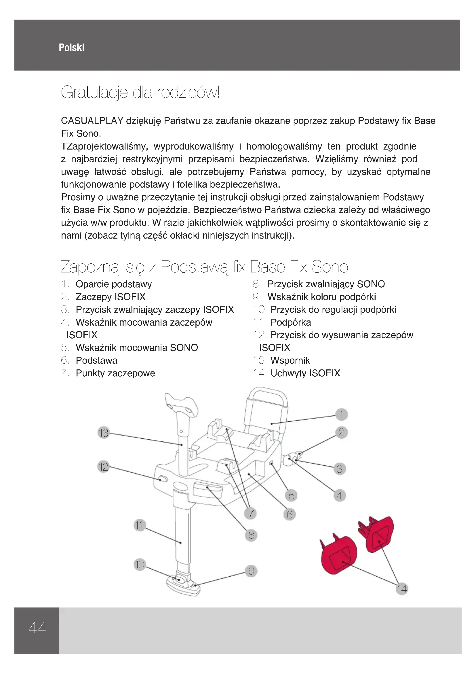 - Pravidelne kontrolujte jednotlivé časti základne a ich správne fungovanie.44 Gratulacje dla rodziców! CASUALPLAY dziękuję Państwu za zaufanie okazane poprzez zakup Podstawy x Base Fix Sono. TZaprojektowaliśmy, wyprodukowaliśmy i homologowaliśmy ten produkt zgodnie z najbardziej restrykcyjnymi przepisami bezpieczeństwa. Wzięliśmy również pod uwagę łatwość obsługi, ale potrzebujemy Państwa pomocy, by uzyskać optymalne funkcjonowanie podstawy i fotelika bezpieczeństwa. Prosimy o uważne przeczytanie tej instrukcji obsługi przed zainstalowaniem Podstawy x Base Fix Sono w pojeździe. Bezpieczeństwo Państwa dziecka zależy od właściwego użycia w/w produktu. W razie jakichkolwiek wątpliwości prosimy o skontaktowanie się z nami (zobacz tylną część okładki niniejszych instrukcji). Zapoznaj się z Podstawą x Base Fix Sono