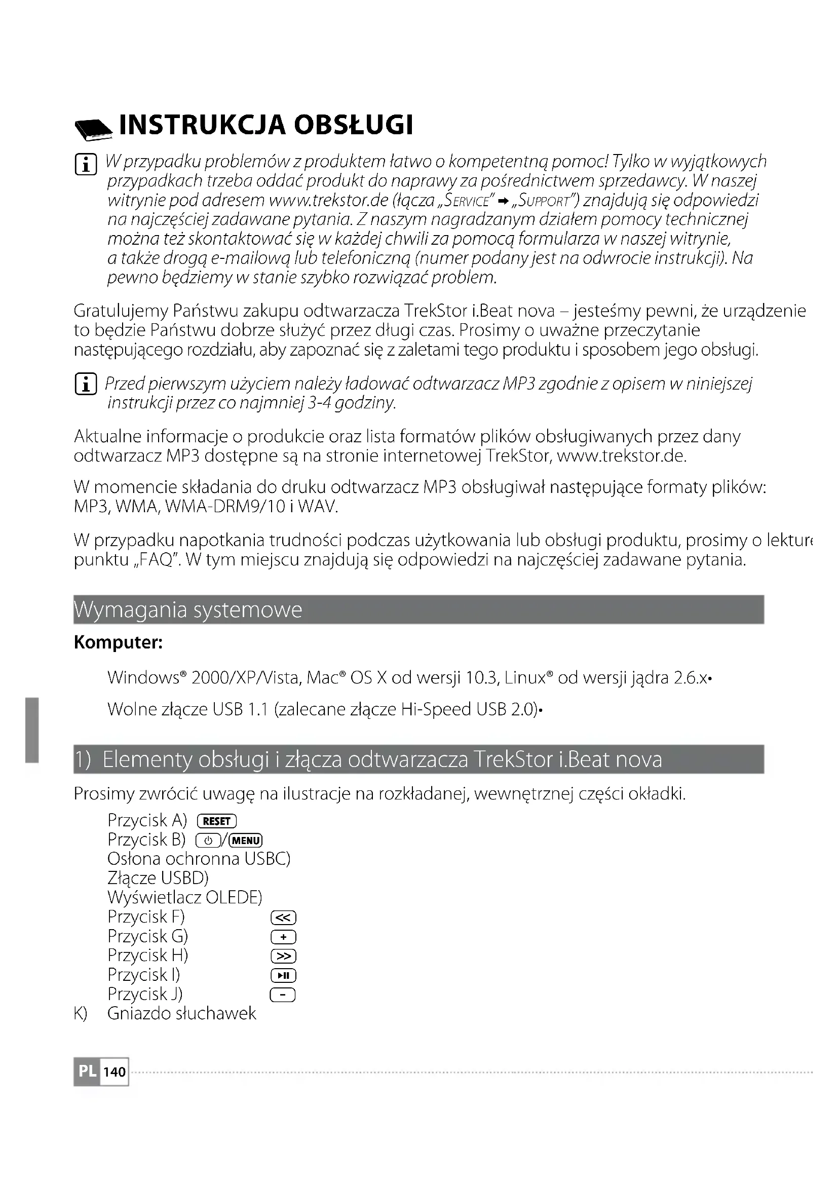 Przed pierwszym użyciem należy ładować odtwarzacz MP3 zgodnie z opisem w niniejszej instrukcji przez co najmniej 3-4 godziny. Aktualne informacje o produkcie oraz lista formatów plików obsługiwanych przez dany odtwarzacz MP3 dostępne są na stronie internetowej TrekStor, www.trekstor.de. W momencie składania do druku odtwarzacz MP3 obsługiwał następujące formaty plików: MP3, WMA, WMA-DRM9/10 i WAV. W przypadku napotkania trudności podczas użytkowania lub obsługi produktu, prosimy o lekturę punktu „FAQ”. W tym miejscu znajdują się odpowiedzi na najczęściej zadawane pytania. Wymagania systemowe Komputer: Windows® 2000/XP/Vista, Mac® OS X od wersji 10.3, Linux® od wersji jądra 2.6.x• Wolne złącze USB 1.1 (zalecane złącze Hi-Speed USB 2.0)•