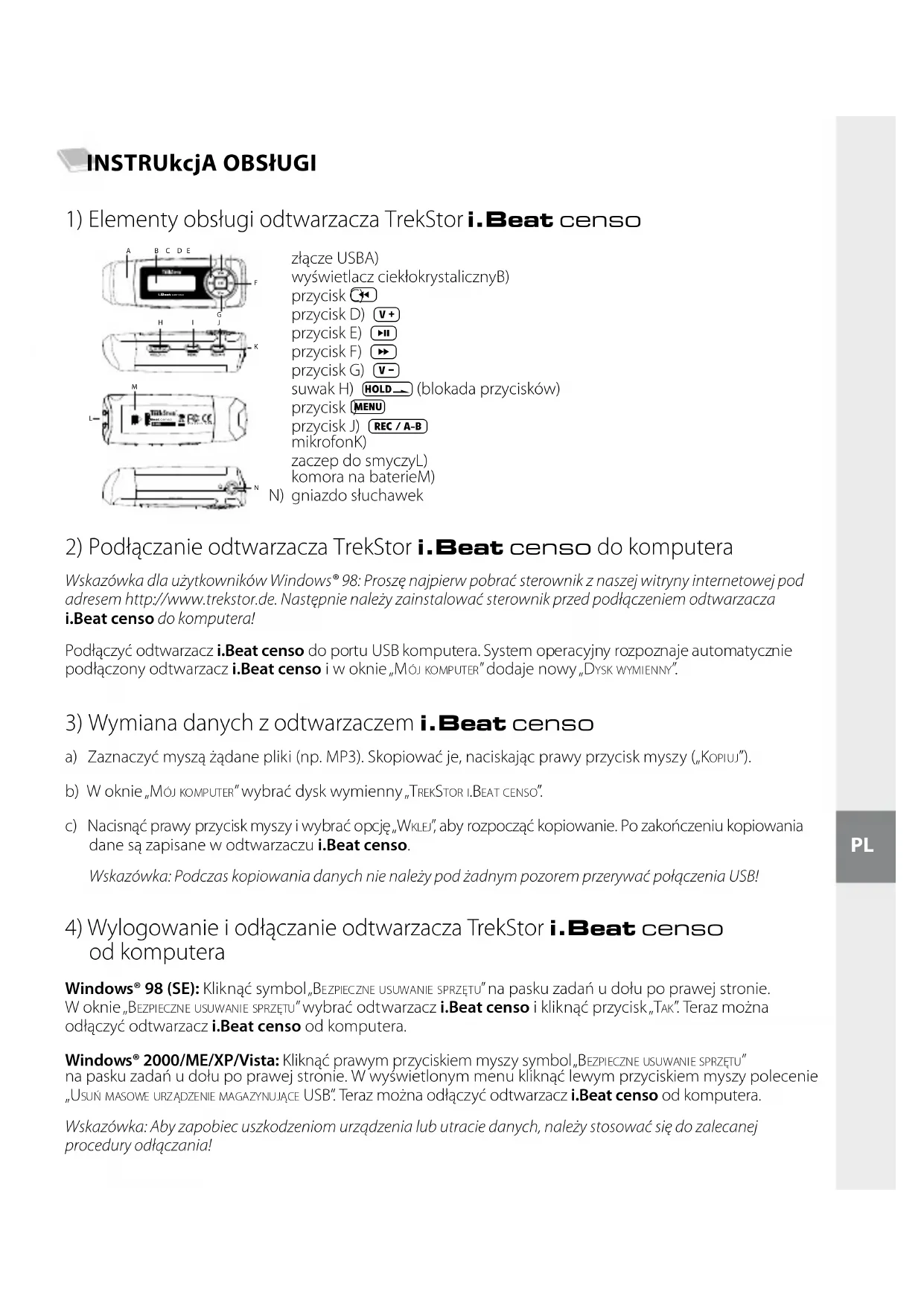 s U ń M A s o W e U r z ą d z e n i e M A g A z y n U J ą c e Usb”. Teraz można odłączyć odtwarzacz i.Beat censo od komputera. Wskazówka: Aby zapobiec uszkodzeniom urządzenia lub utracie danych, należy stosować się do zalecanej procedury odłączania! I"EAT CENSO.BEFJO$IJOBI"EAT CENSO! " # $ %&'( ) *