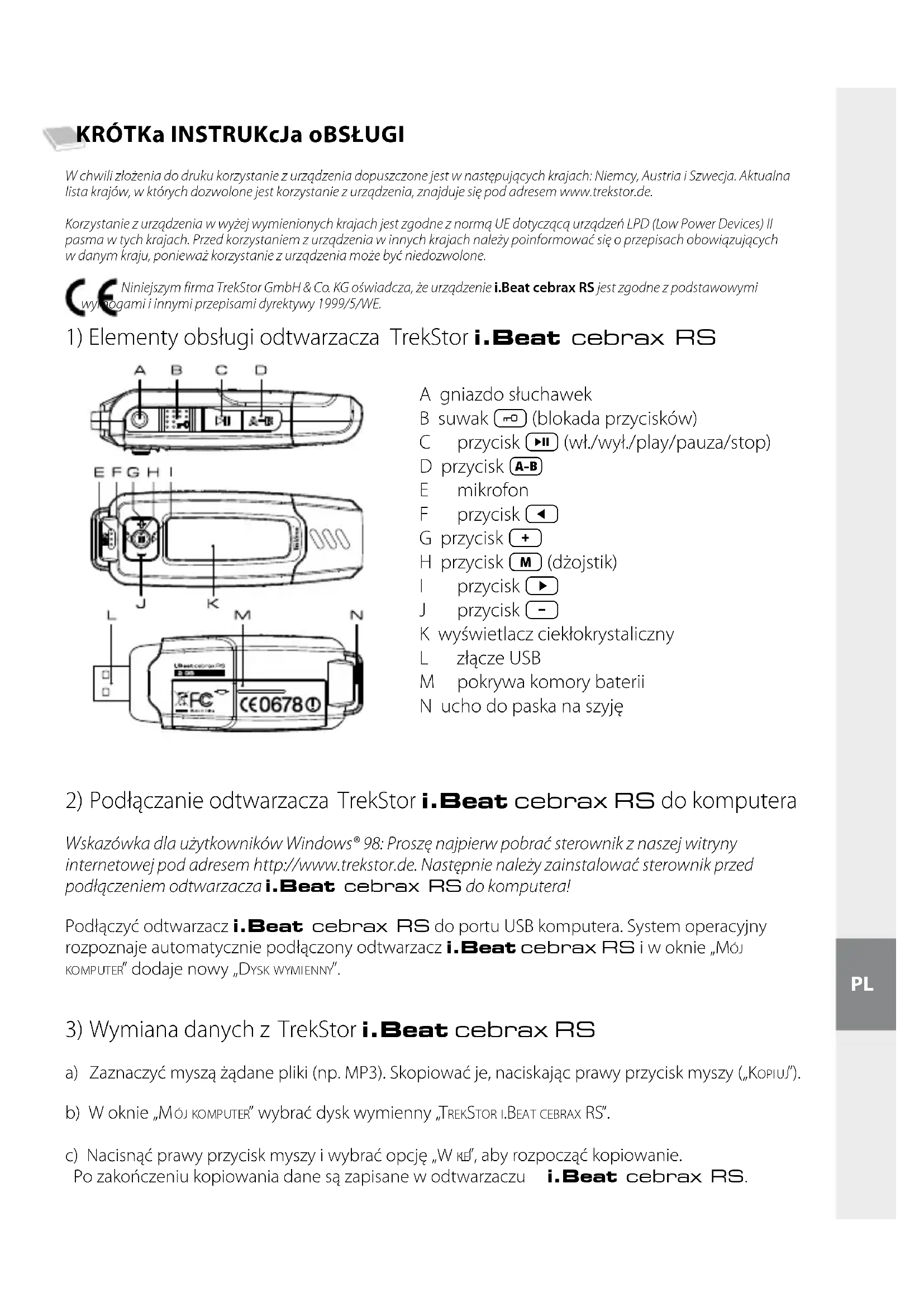 KRóTKa INSTRUKcja obSłUGI W chwili złożenia do druku korzystanie z urządzenia dopuszczone jest w następujących krajach: Niemcy, Austria i Szwecja. Aktualna lista krajów, w których dozwolone jest korzystanie z urządzenia, znajduje się pod adresem www.trekstor.de. Korzystanie z urządzenia w wyżej wymienionych krajach jest zgodne z normą UE dotyczącą urządzeń LPD (Low Power Devices) II pasma w tych krajach. Przed korzystaniem z urządzenia w innych krajach należy poinformować się o przepisach obowiązujących w danym kraju, ponieważ korzystanie z urządzenia może być niedozwolone. Niniejszym firma TrekStor GmbH & Co. KG oświadcza, że urządzenie i.Beat cebrax RS jest zgodne z podstawowymi wymogami i innymi przepisami dyrektywy 1999/5/WE.
