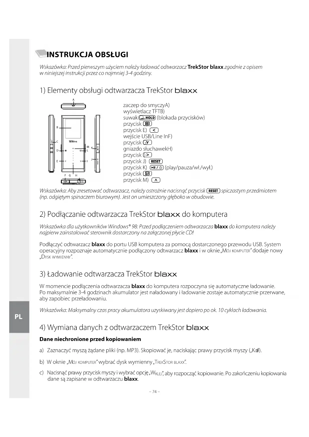 Wskazówka: Przed pierwszym użyciem należy ładować odtwarzacz TrekStor blaxx zgodnie z opisem w niniejszej instrukcji przez co najmniej 3-4 godziny.