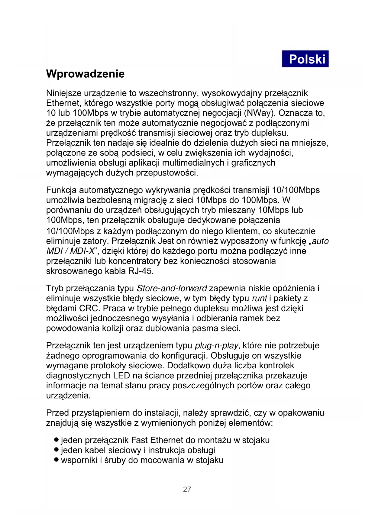 26Polski. Wprowadzenie Niniejsze urządzenie to wszechstronny, wysokowydajny przełącznik Ethernet, którego wszystkie porty mogą obsługiwać połączenia sieciowe 10 lub 100Mbps w trybie automatycznej negocjacji (NWay). Oznacza to, że przełącznik ten może automatycznie negocjować z podłączonymi urządzeniami prędkość transmisji sieciowej oraz tryb dupleksu. Przełącznik ten nadaje się idealnie do dzielenia dużych sieci na mniejsze, połączone ze sobą podsieci, w celu zwiększenia ich wydajności, umożliwienia obsługi aplikacji multimedialnych i graficznych wymagających dużych przepustowości. Funkcja automatycznego wykrywania prędkości transmisji 10/100Mbps umożliwia bezbolesną migrację z sieci 10Mbps do 100Mbps. W porównaniu do urządzeń obsługujących tryb mieszany 10Mbps lub 100Mbps, ten przełącznik obsługuje dedykowane połączenia 10/100Mbps z każdym podłączonym do niego klientem, co skutecznie eliminuje zatory. Przełącznik Jest on również wyposażony w funkcję „auto MDI / MDI-X”, dzięki której do każdego portu można podłączyć inne przełączniki lub koncentratory bez konieczności stosowania skrosowanego kabla RJ-45. Tryb przełączania typu Store-and-forward zapewnia niskie opóźnienia i eliminuje wszystkie błędy sieciowe, w tym błędy typu runt i pakiety z błędami CRC. Praca w trybie pełnego dupleksu możliwa jest dzięki możliwości jednoczesnego wysyłania i odbierania ramek bez powodowania kolizji oraz dublowania pasma sieci. Przełącznik ten jest urządzeniem typu plug-n-play, które nie potrzebuje żadnego oprogramowania do konfiguracji. Obsługuje on wszystkie wymagane protokoły sieciowe. Dodatkowo duża liczba kontrolek diagnostycznych LED na ściance przedniej przełącznika przekazuje informacje na temat stanu pracy poszczególnych portów oraz całego urządzenia. Przed przystąpieniem do instalacji, należy sprawdzić, czy w opakowaniu znajdują się wszystkie z wymienionych poniżej elementów: jeden przełącznik Fast Ethernet do montażu w stojaku jeden kabel sieciowy i instrukcja obsługi wsporniki i śruby do mocowania w stojaku